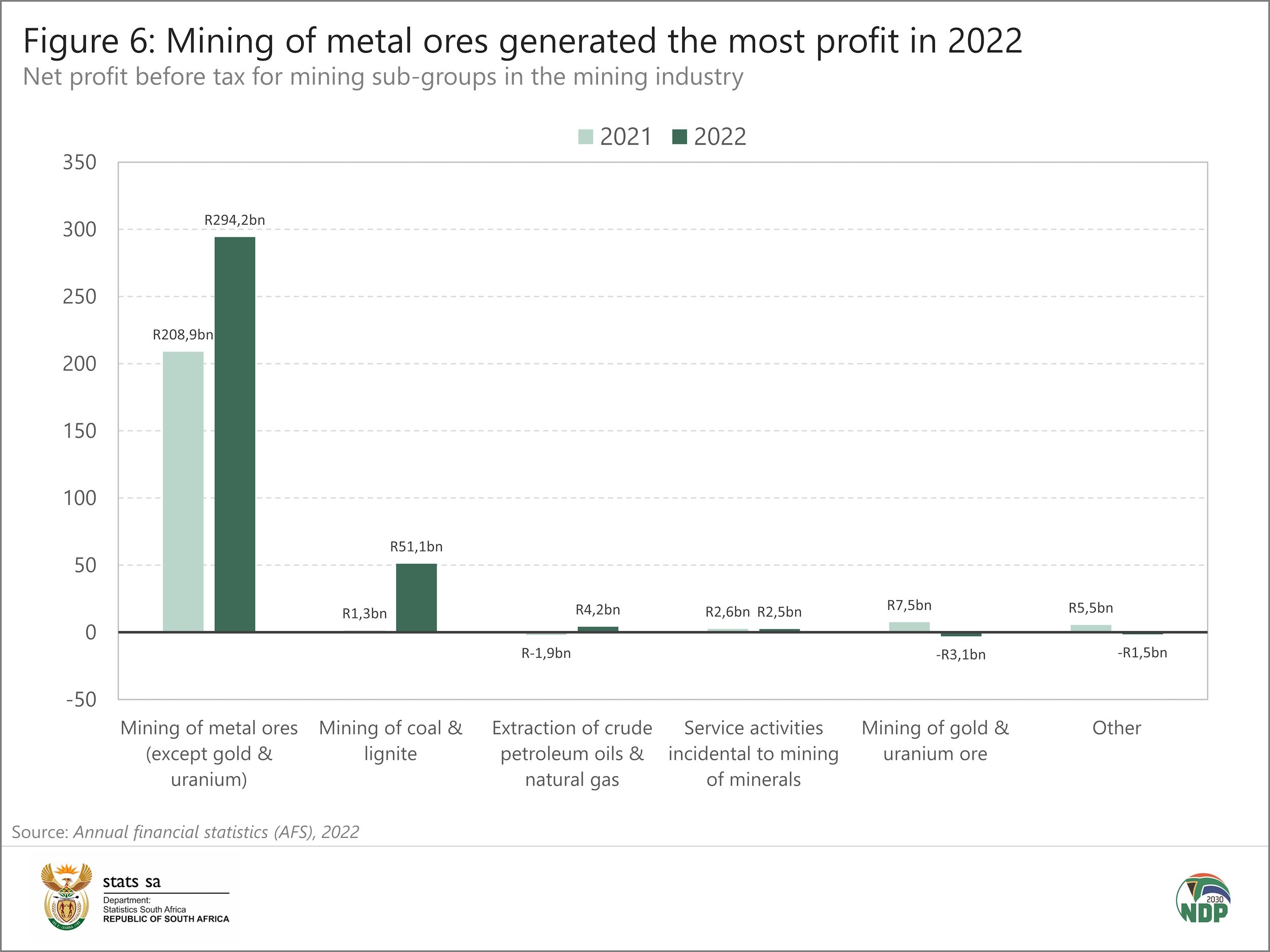 The mining of metal ores (except gold & uranium) sub-group also registered the highest net profit (before tax) in 2022, followed by the mining of coal & lignite sub-group (Figure 6). The mining of gold & uranium ore sub-group registered a loss in the same year
