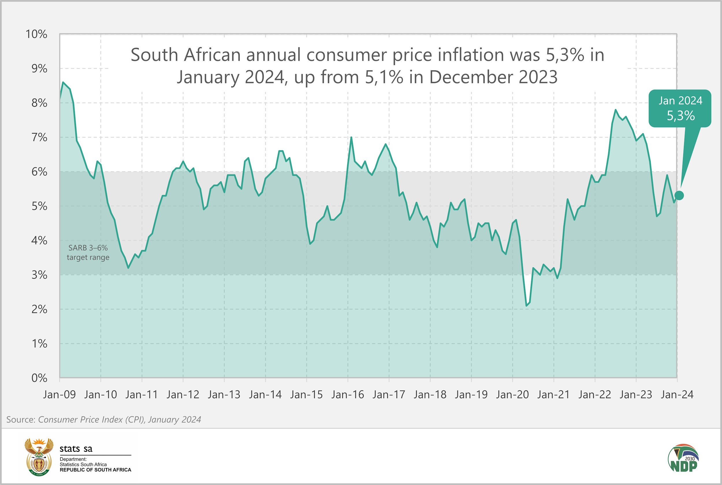 After two consecutive months of decline, annual consumer inflation crept up in January, rising to 5,3% from 5,1% in December. The monthly change in the consumer price index (CPI) was 0,1% in January.