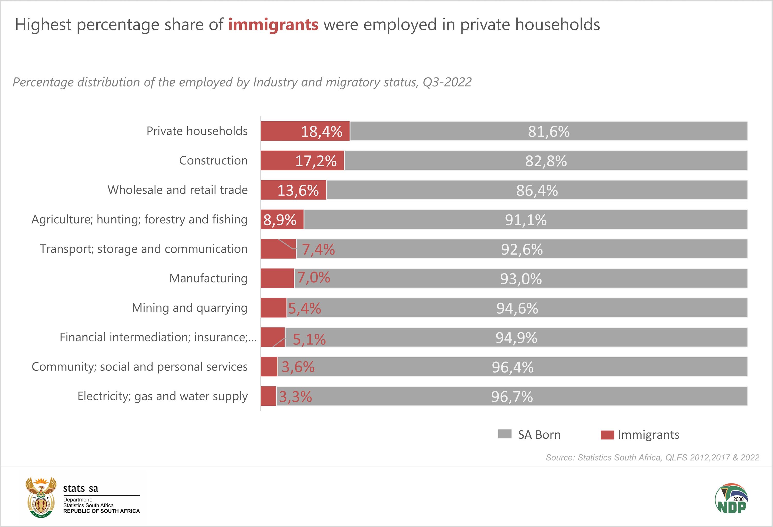 The findings on immigration for employment revealed that the proportion of employed immigrants within the overall workforce rose from 6,0% in Q3: 2012 to 8,9% in Q3:2022, while the majority of employed individuals were South African-born persons across the three surveyed period. The highest proportion of immigrants were employed in private households at 18,4%, followed by the Construction (17,2%) and Wholesale and retail trade (13,6%) industries.