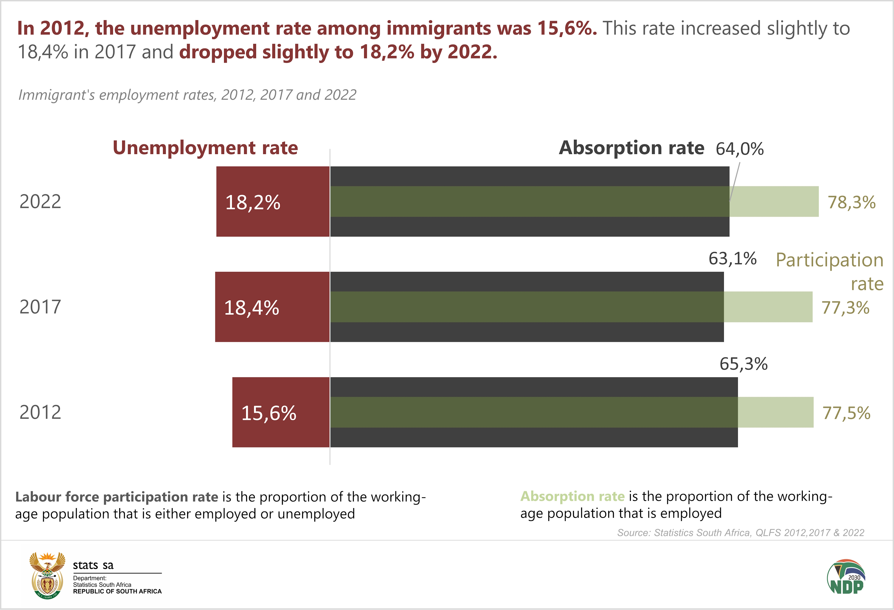 The labour force participation rate (LFPR), which measures the percentage of the working-age population actively participating in the labour force, was 77,5% among immigrants in 2012. The LFPR decreased slightly to 77,3% by 2017 and increased to 78,3% in 2022, indicating a fluctuation in labour force participation.