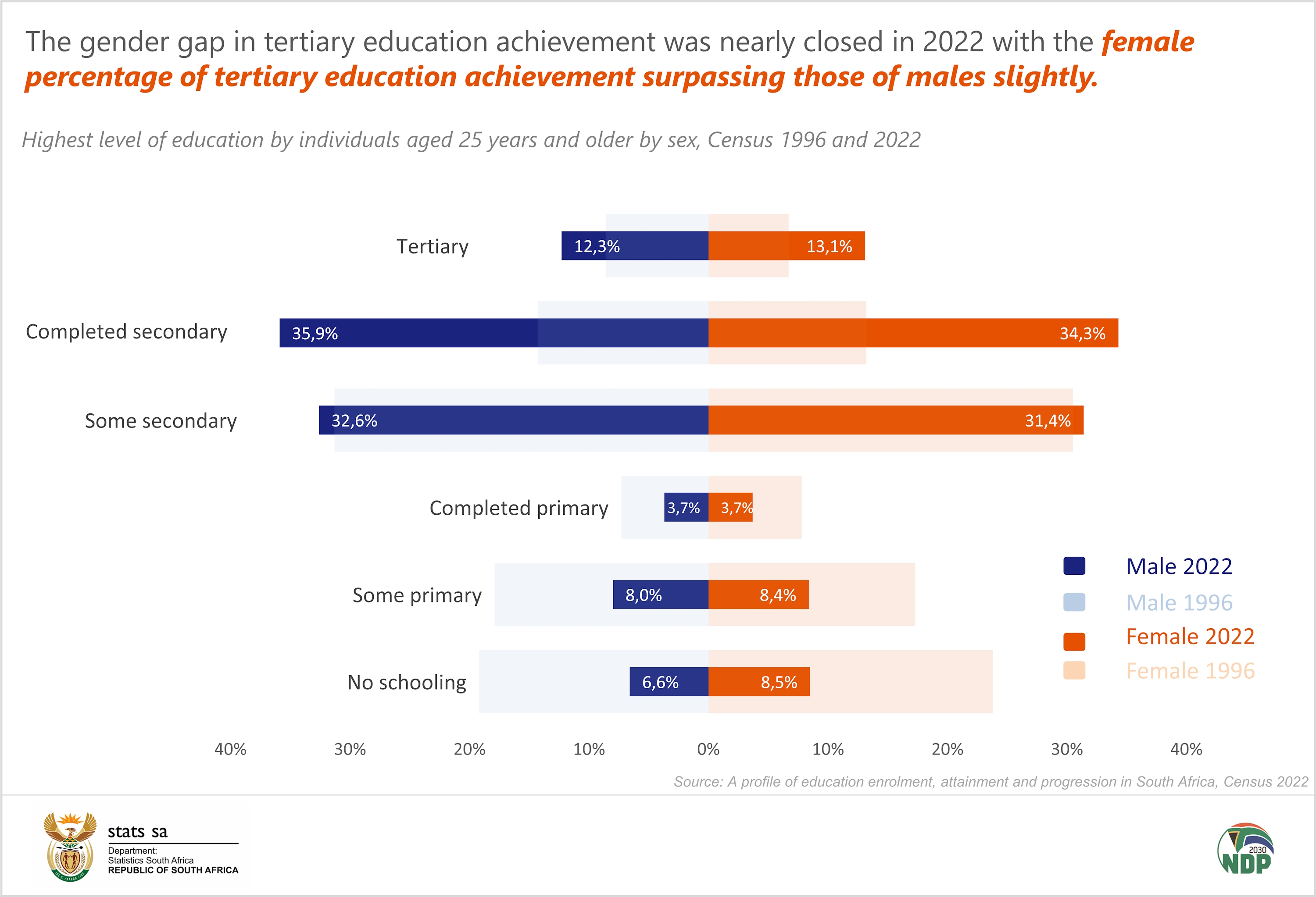 The data reveals a notable achievement in South Africa’s educational landscape, particularly concerning gender parity in tertiary education attainment. In 2022, the gender gap in tertiary education attainment was nearly closed, with the percentage of females surpassing that of males. Specifically, 13,1% of females attained tertiary qualifications, compared to 12,3% of males. This marks a significant advancement from 1996, when only 6,7% of females and 8,6% of males had obtained tertiary education.