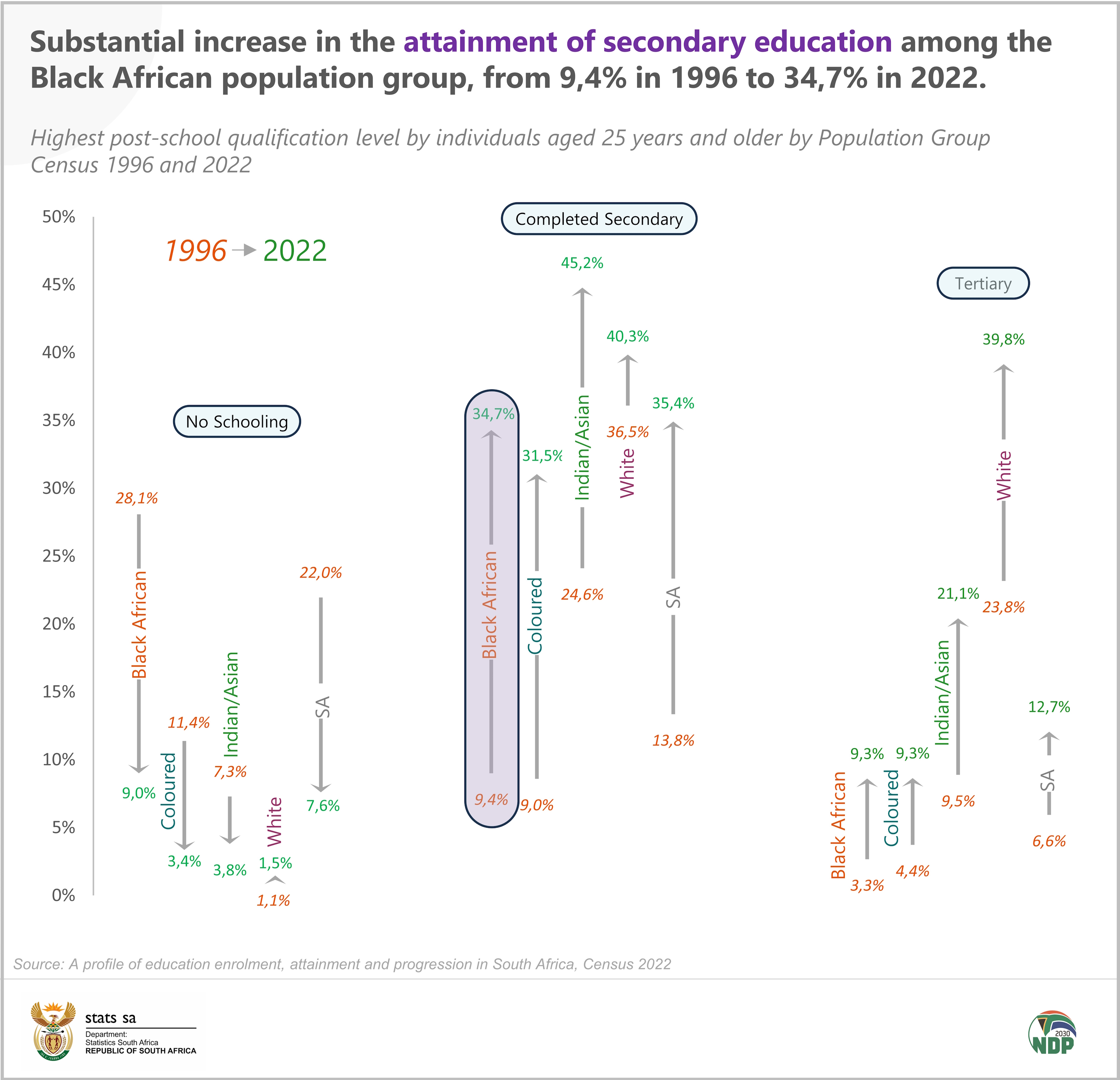 Furthermore, the data highlights a substantial increase in the attainment of secondary education among black Africans. Specifically, the percentage of individuals with secondary education more than tripled from 9,4% in 1996 to 34,7% in 2022. There was also a large increase in tertiary education attainment with the gaps between coloureds and black Africans having closed. This surge in secondary and tertiary education attainment signifies a positive trend towards greater access to and completion of higher levels of education within the black African population group.