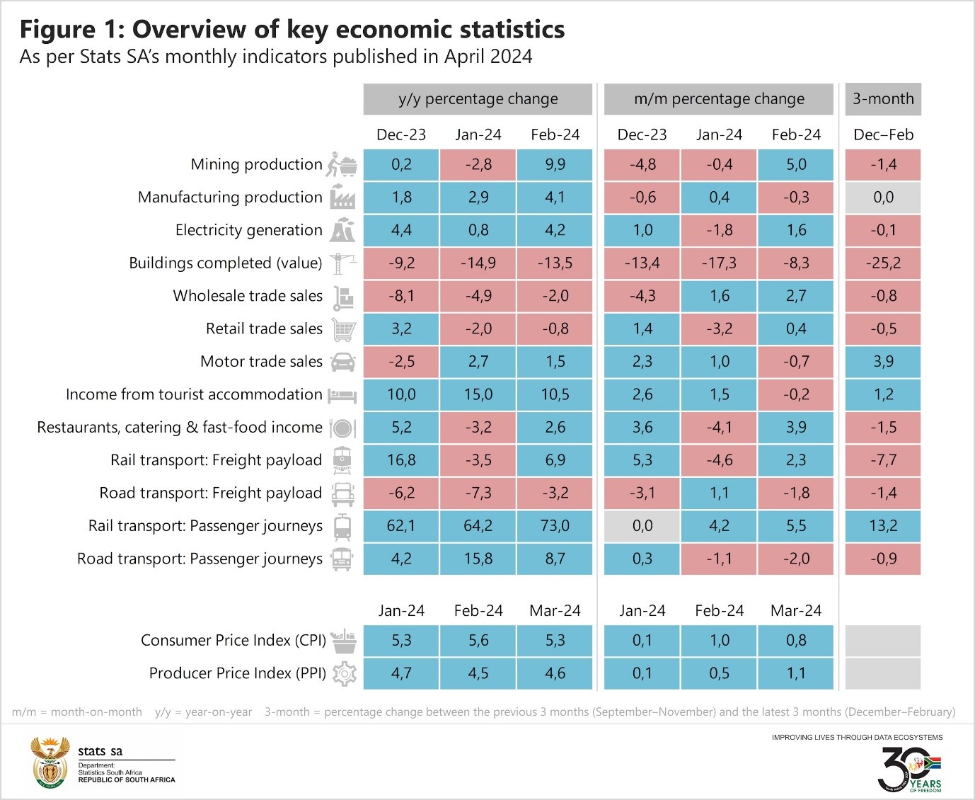 Notable releases in May include the next Quarterly Labour Force Survey (QLFS) release on 14 May, covering employment and unemployment data for the first quarter of 2024. The 2023 General Household Survey (GHS) will be released on 23 May.