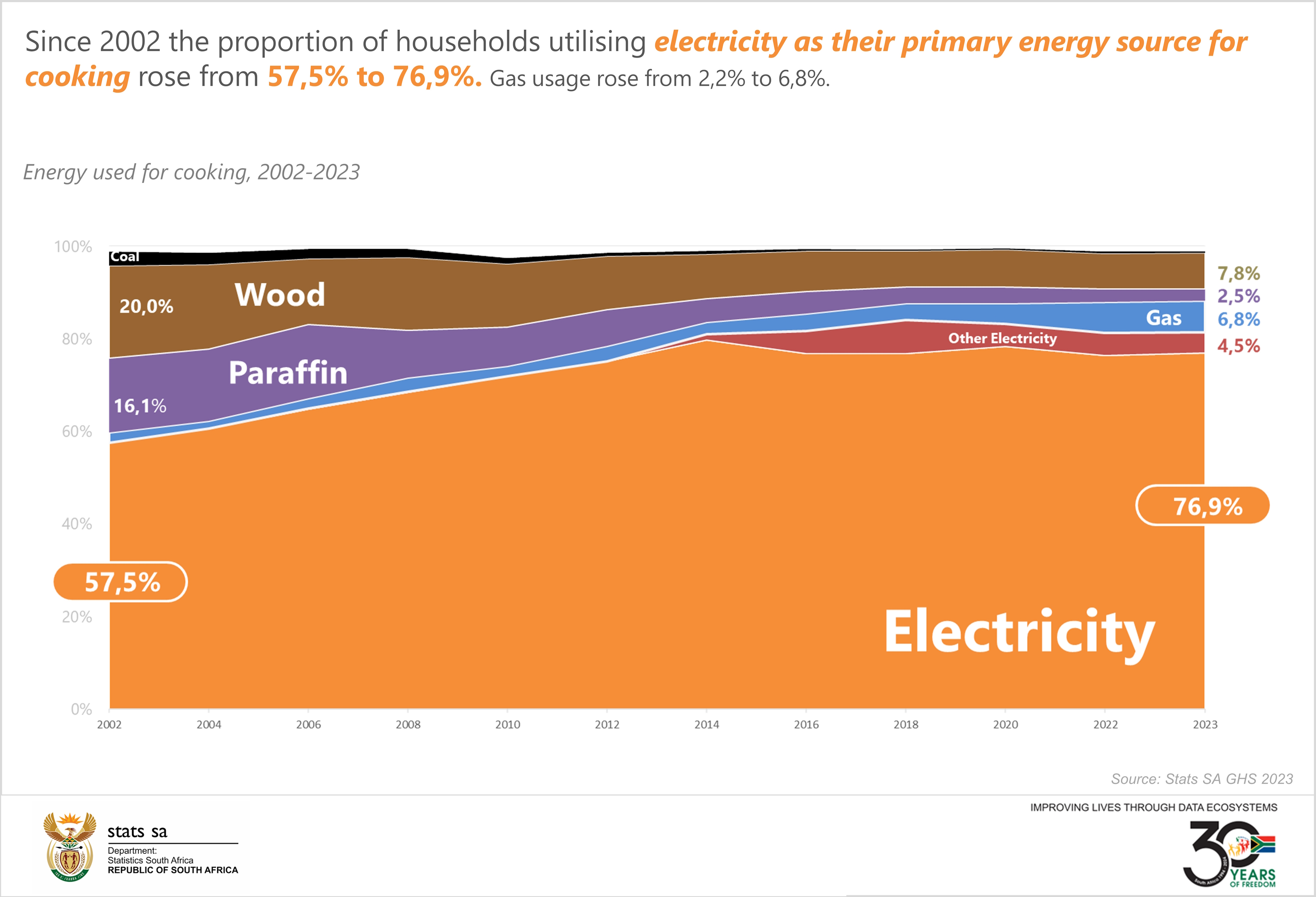 Since 2002, there has been a notable increase in access to mains electricity, rising from 76,7% to 89,8%. For households in formal dwellings, this access increased from 86,4% to 94,6%, while for those in informal dwellings, it rose from 52,3% to 58,3%. This improved access to electricity has had significant effects on households. The proportion of households utilising electricity as their primary energy source for cooking rose from 57,5% to 76,9%. Conversely, the use of paraffin decreased to 2,5% from 16%, and the reliance on wood or coal dropped from 23% to 8,1%. Gas usage rose from 2,2% to 6,8%.