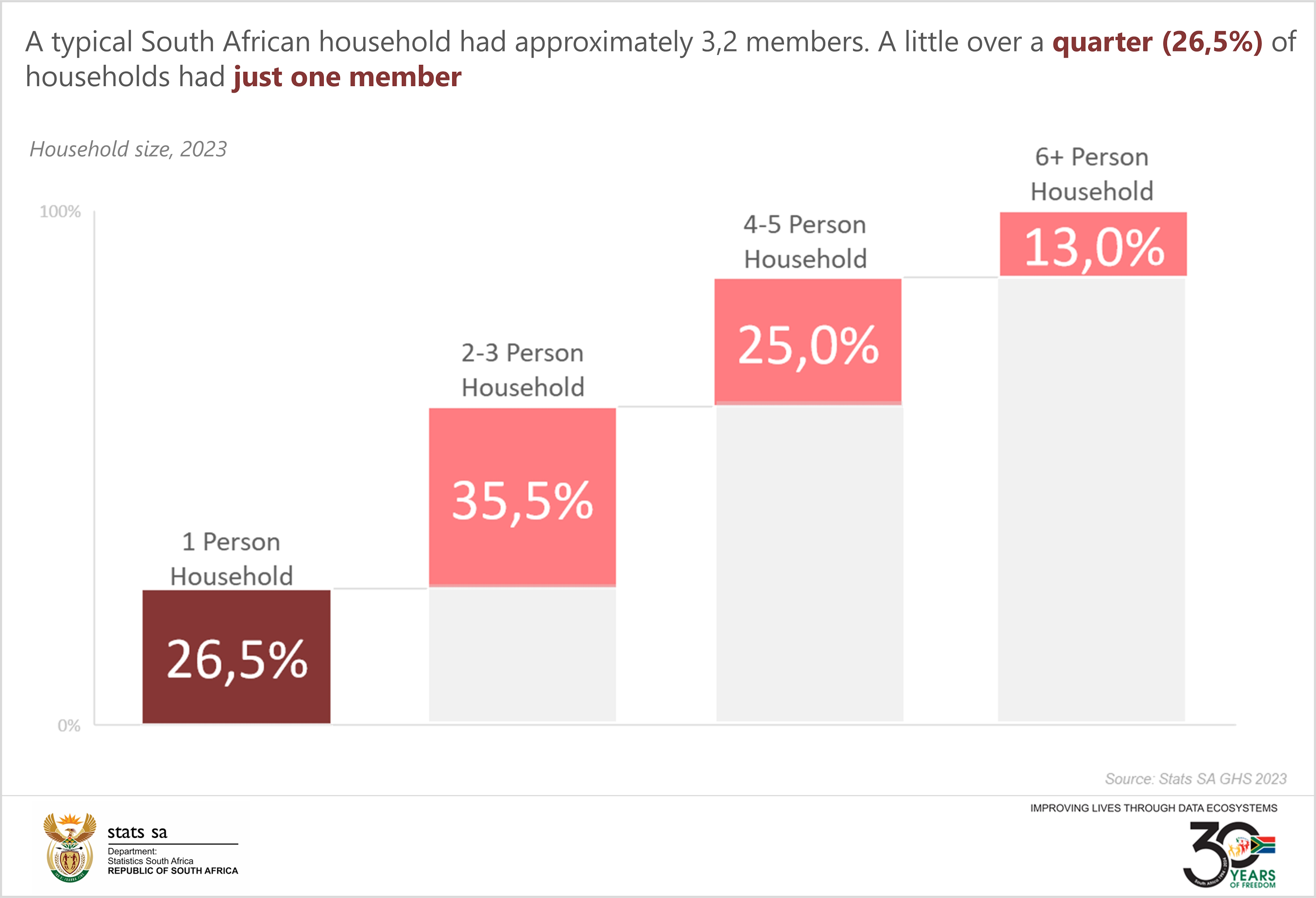 According to the General Household Survey, 2023 released by Statistics South Africa, a typical South African household had approximately 3,2 members. A little over a quarter (26,5%) of households had just one member. Meanwhile, more than three-quarters (87%) of homes had four to five members or fewer, while only 13% of households contained six members or more.