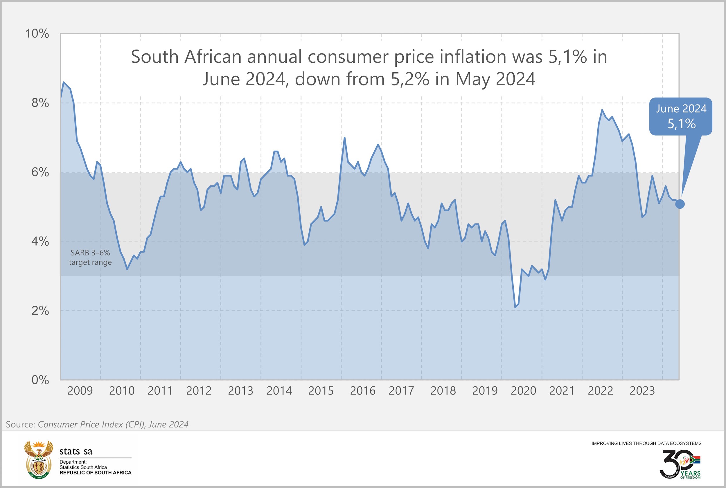 The annual change in the consumer price index (CPI) was 5,1% in June, down from 5,2% in May. Inflation has remained within the 5% to 6% range for the past 10 months.