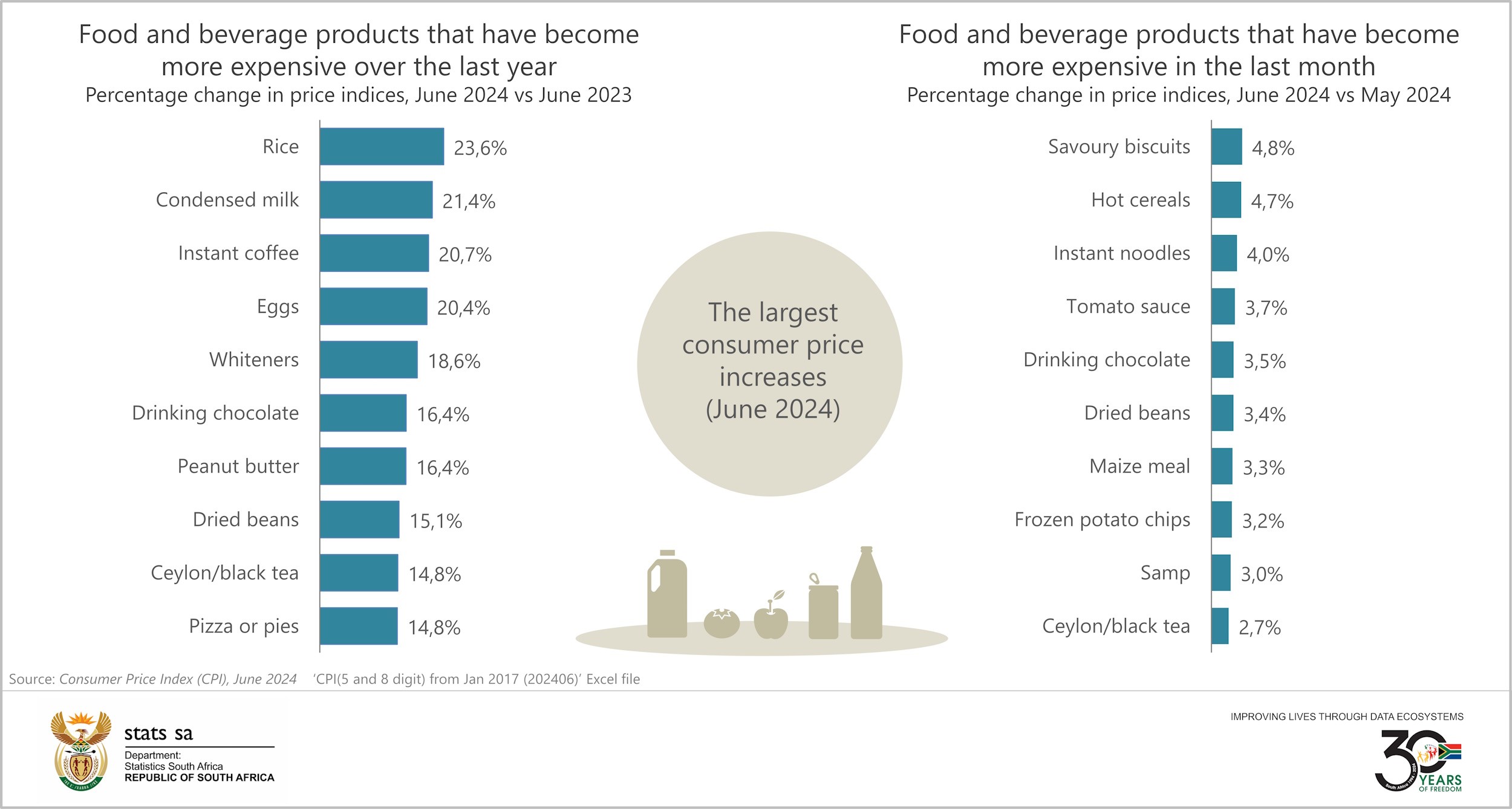The graphs below show food and beverage products that recorded the most significant annual and monthly price increases in June.