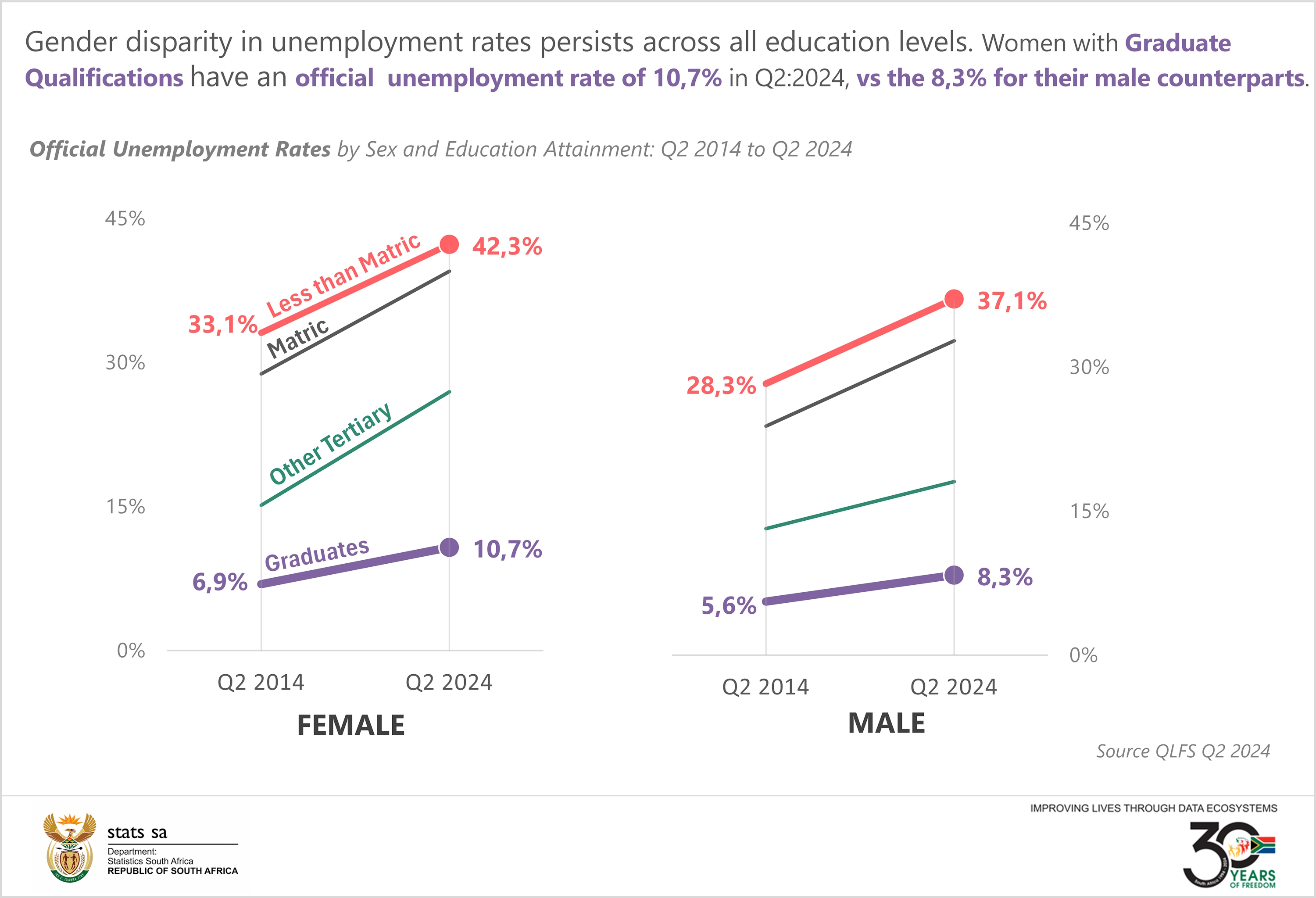Over the 10-year span from Q2:2014 to Q2:2024, gender disparity in unemployment rates has persisted across all education levels in South Africa. Women, irrespective of their educational background—whether they have less than a matric certificate, a matric certificate, other tertiary qualifications, or a graduate degree—consistently face higher unemployment rates compared to men.