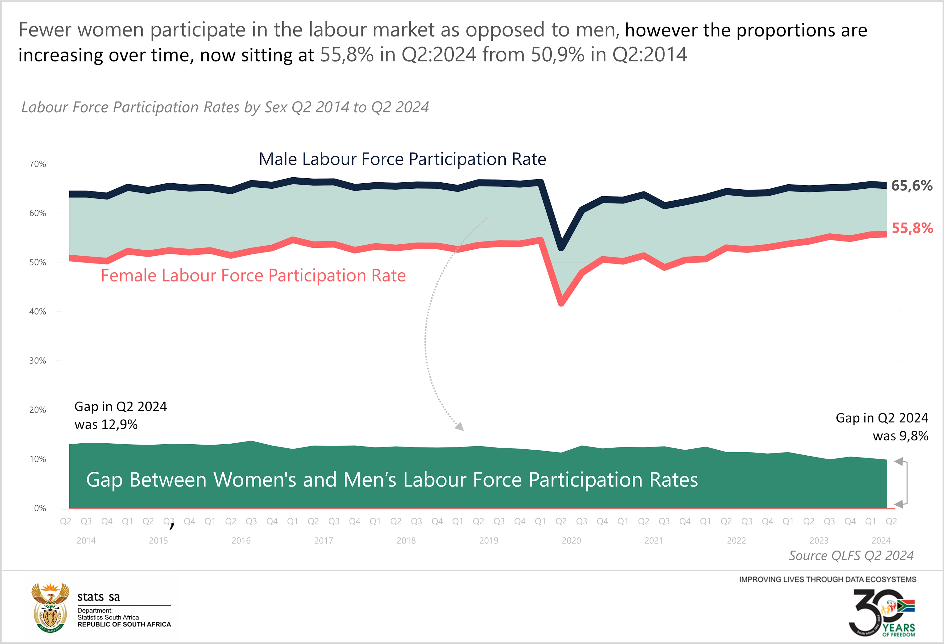 The data shows a general increase in labour force participation rates for both men and women between Q2:2014 and Q2:2024. This increase was more substantial for women, rising to 55,8% in Q2:2024 from 50,9% in Q2:2014 (up by 4,9 percentage points), indicating a narrowing of the gender gap in labour force participation.