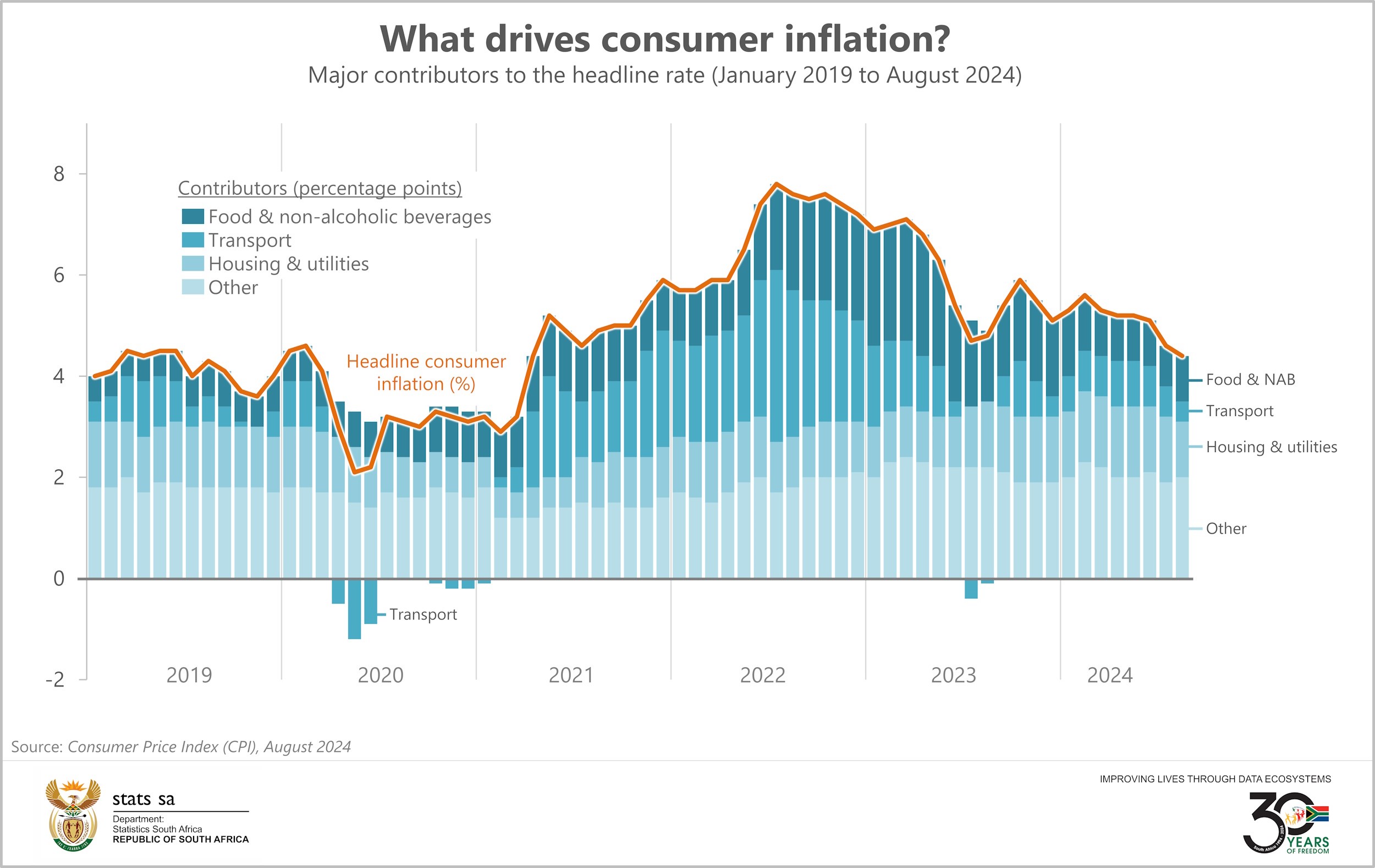 Consumer inflation slowed for a third consecutive month, cooling to 4,4% in August from 4,6% in July. This is the lowest inflation print since April 2021 when the rate was also 4,4%. Lower annual rates were recorded for several product groups, most notably transport, housing, and restaurants & hotels. In contrast, inflation for food & non-alcoholic beverages (NAB) and alcoholic beverages & tobacco edged higher in August.