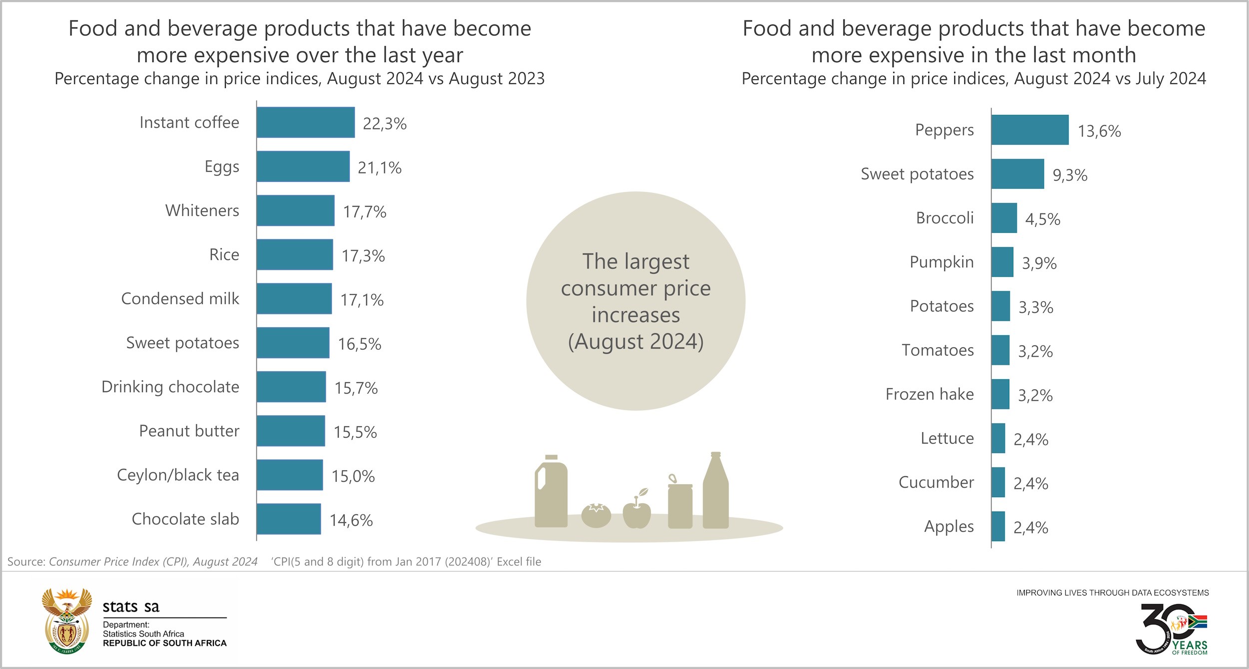 The graphs below show food and beverage products that recorded the most significant annual and monthly price increases in August.