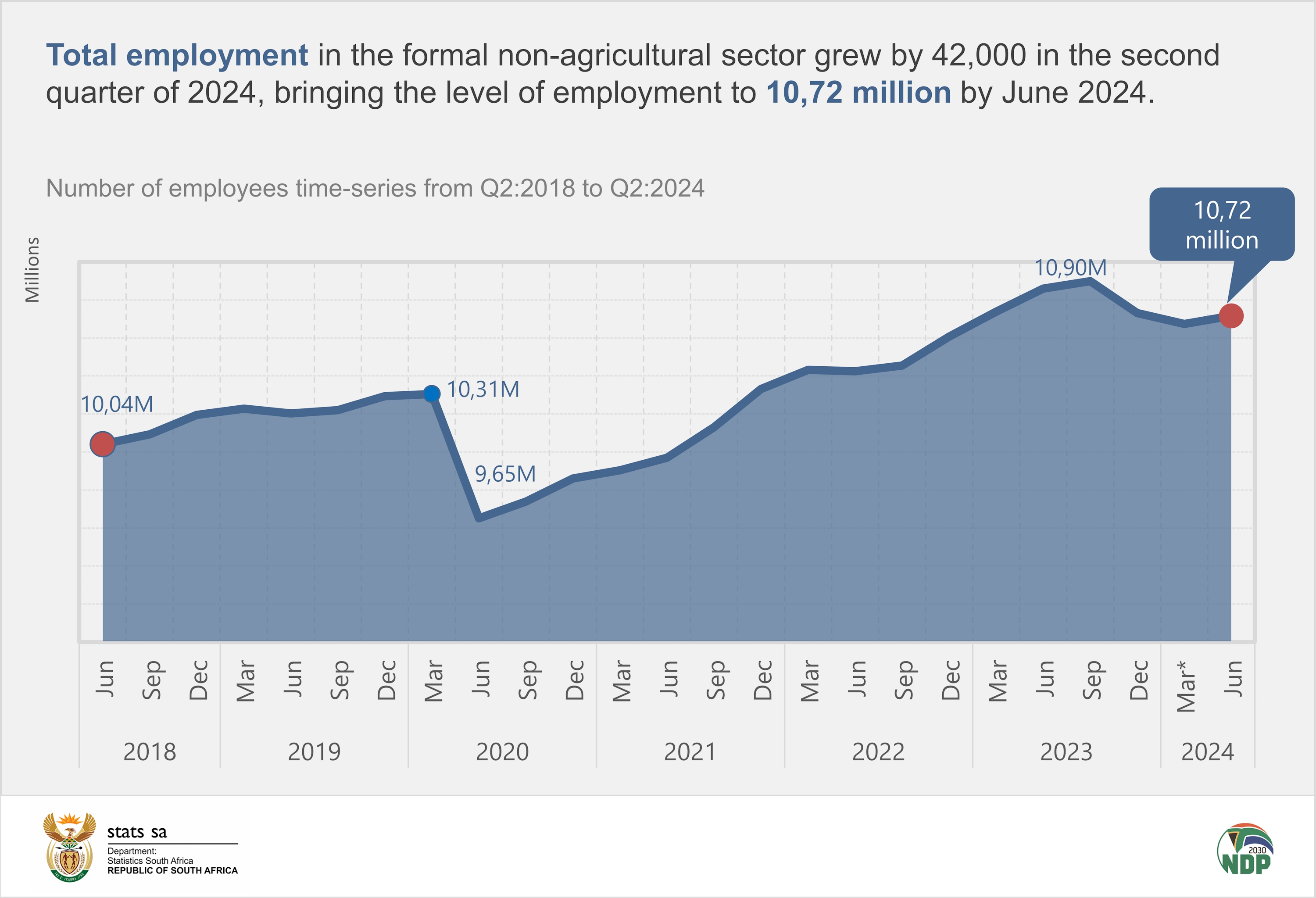 According to the Quarterly Employment Statistics (QES, Q2:2024) survey released by Statistics South Africa (Stats SA), total employment in the formal non-agricultural sector increased by 42 000 in the second quarter of 2024, bringing the level of employment to 10,7 million. According to the survey 144 000 jobs were lost between June 2023 and June 2024.