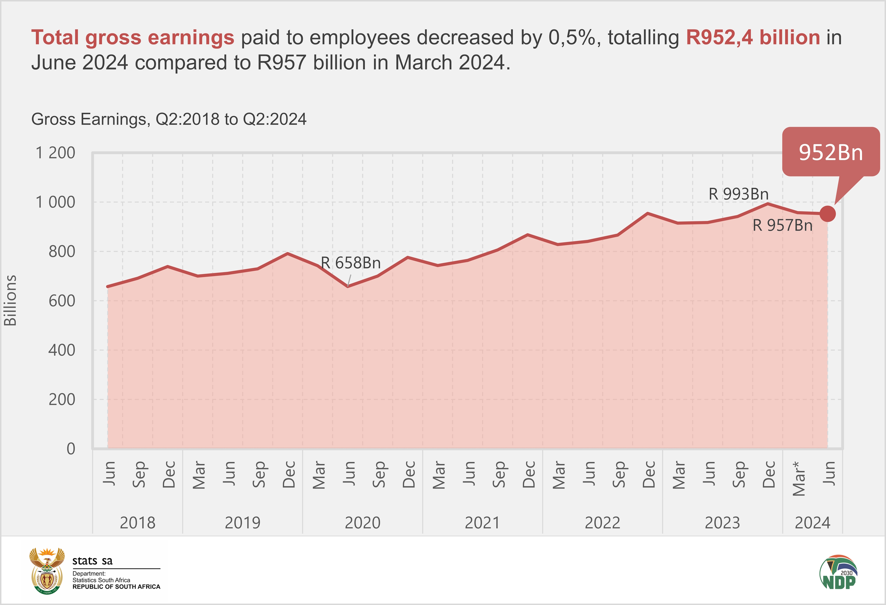 Year-on-year, from June 2023 to June 2024, basic salaries and wages paid to employees increased by 4,4% or R36,8 billion.