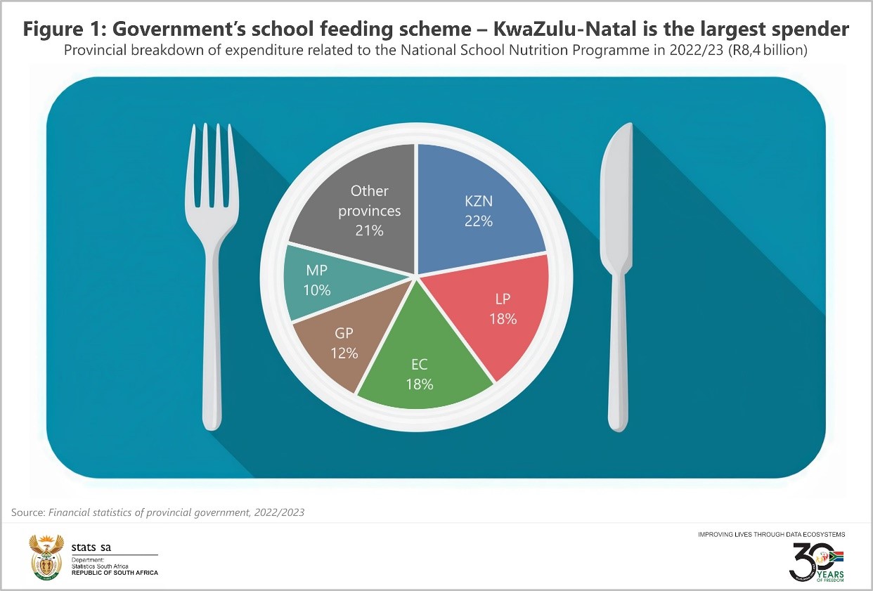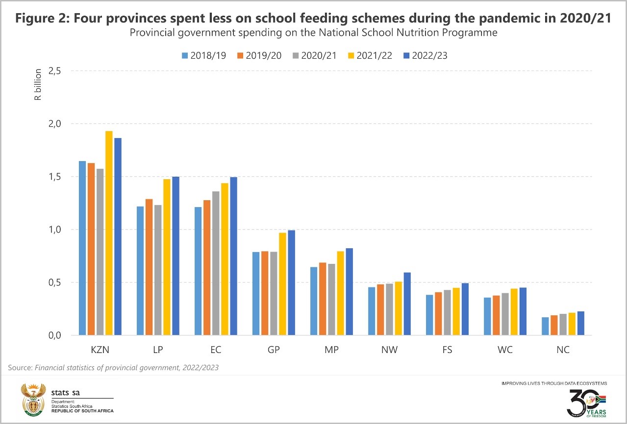 The task of managing the country’s education system lies mainly with provincial government, making it the financial custodian of the programme. Provincial government spent R299,7 billion on education in 2022/23, according to data from the latest Financial statistics of provincial government statistical release.2 The NSNP accounted for 2,8% (or R8,4 billion) of this total.