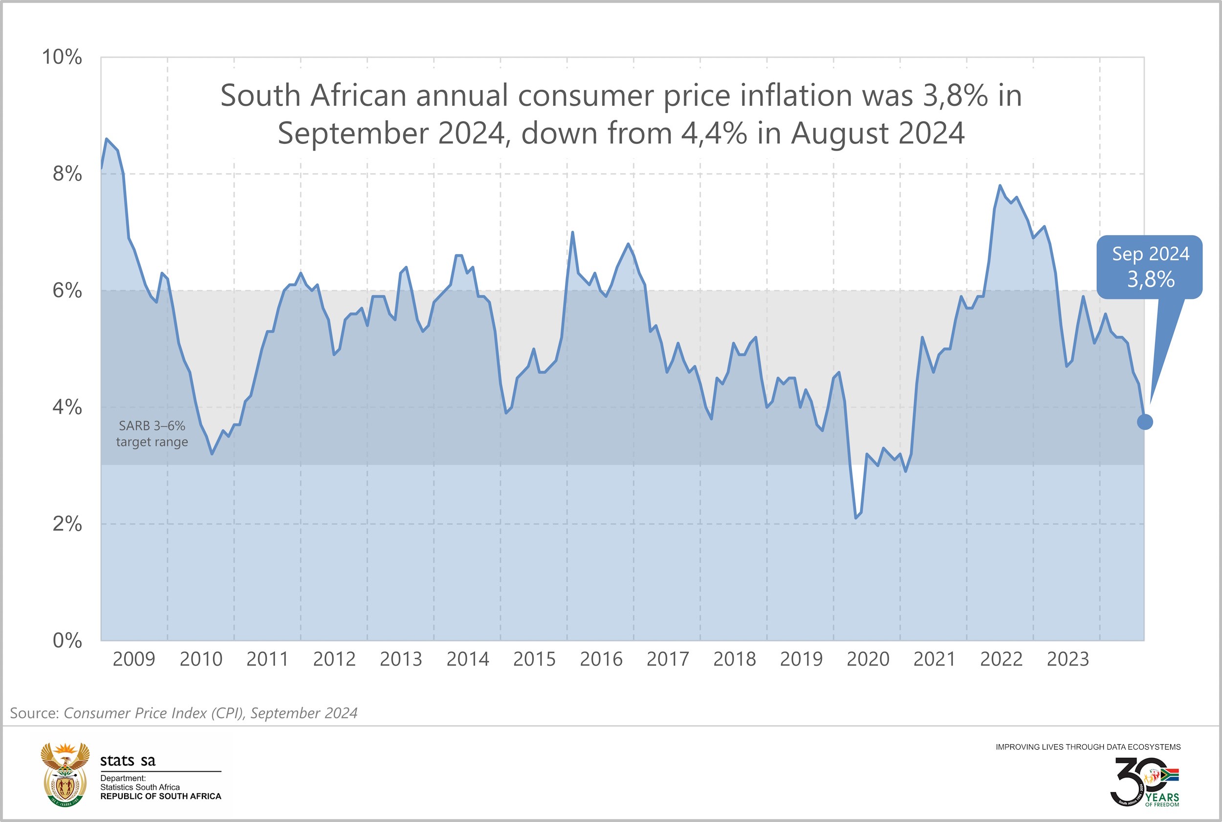 Annual consumer inflation cooled for a fourth consecutive month, easing to 3,8% in September from 4,4% in August. This is the lowest inflation print since March 2021, when the rate was 3,2%. On average, prices increased by 0,1% between August 2024 and September 2024.