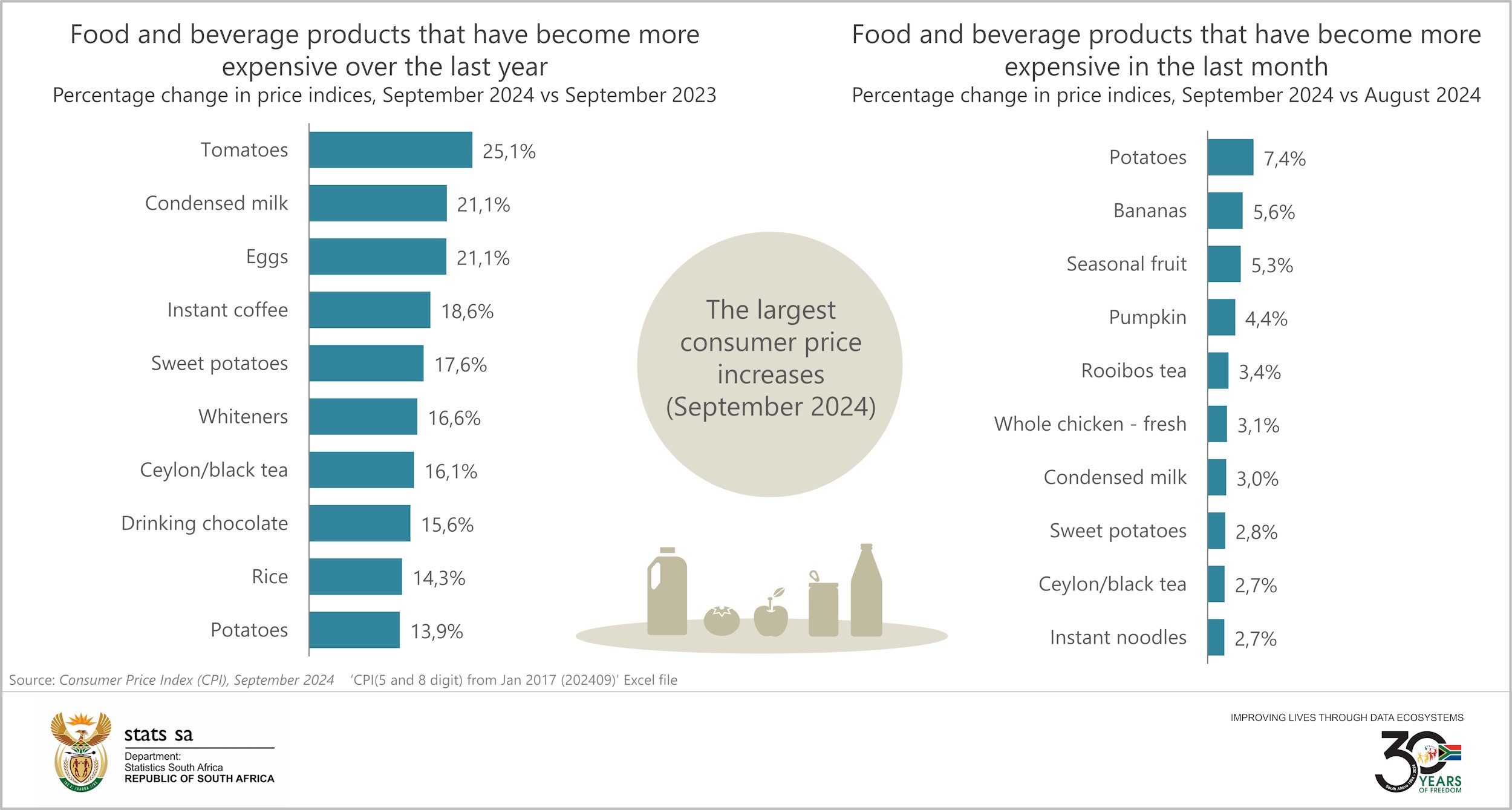 The graphs below show food and beverage products that recorded the most significant annual and monthly price increases in September. Tomatoes, condensed milk, eggs and instant coffee continue to witness high annual price increases.