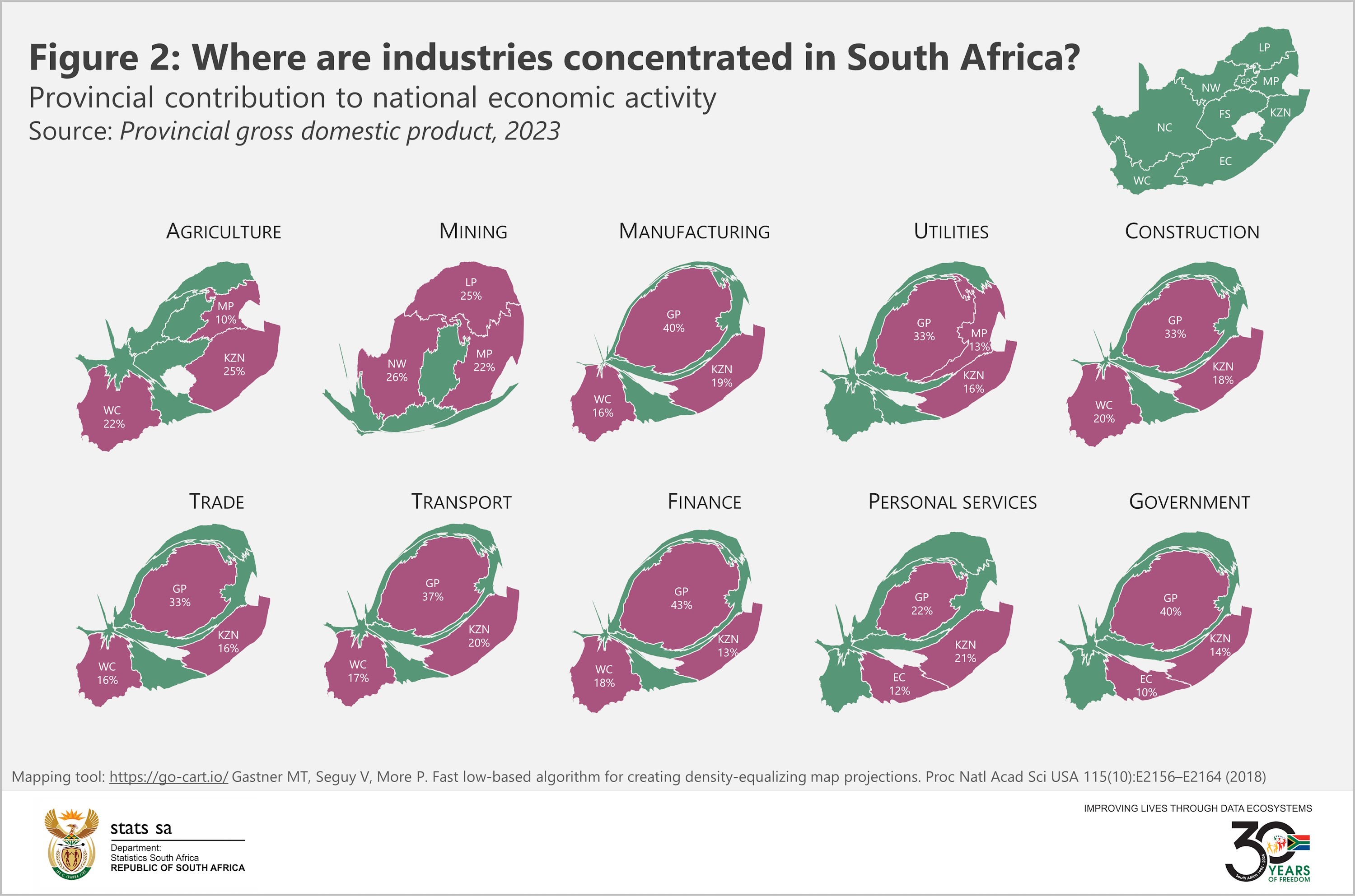 Industrial activity is clustered in various parts of the country. A neat way to highlight how industries are distributed across South Africa is with the use of cartograms1 (Figure 2). National agricultural production, for example, is concentrated in KwaZulu-Natal, Western Cape and Mpumalanga. Together, these three provinces account for almost 60% of national agricultural activity.