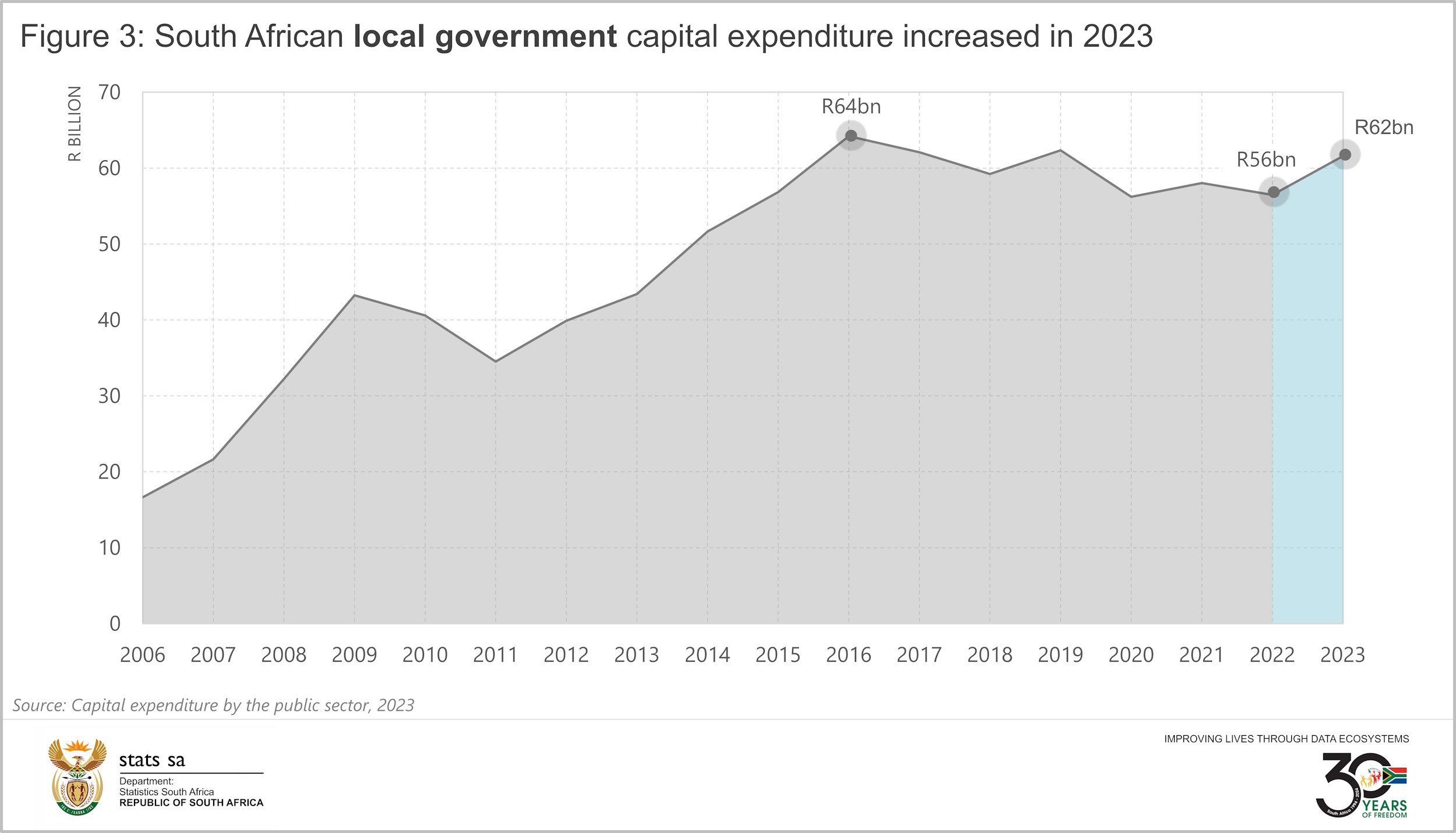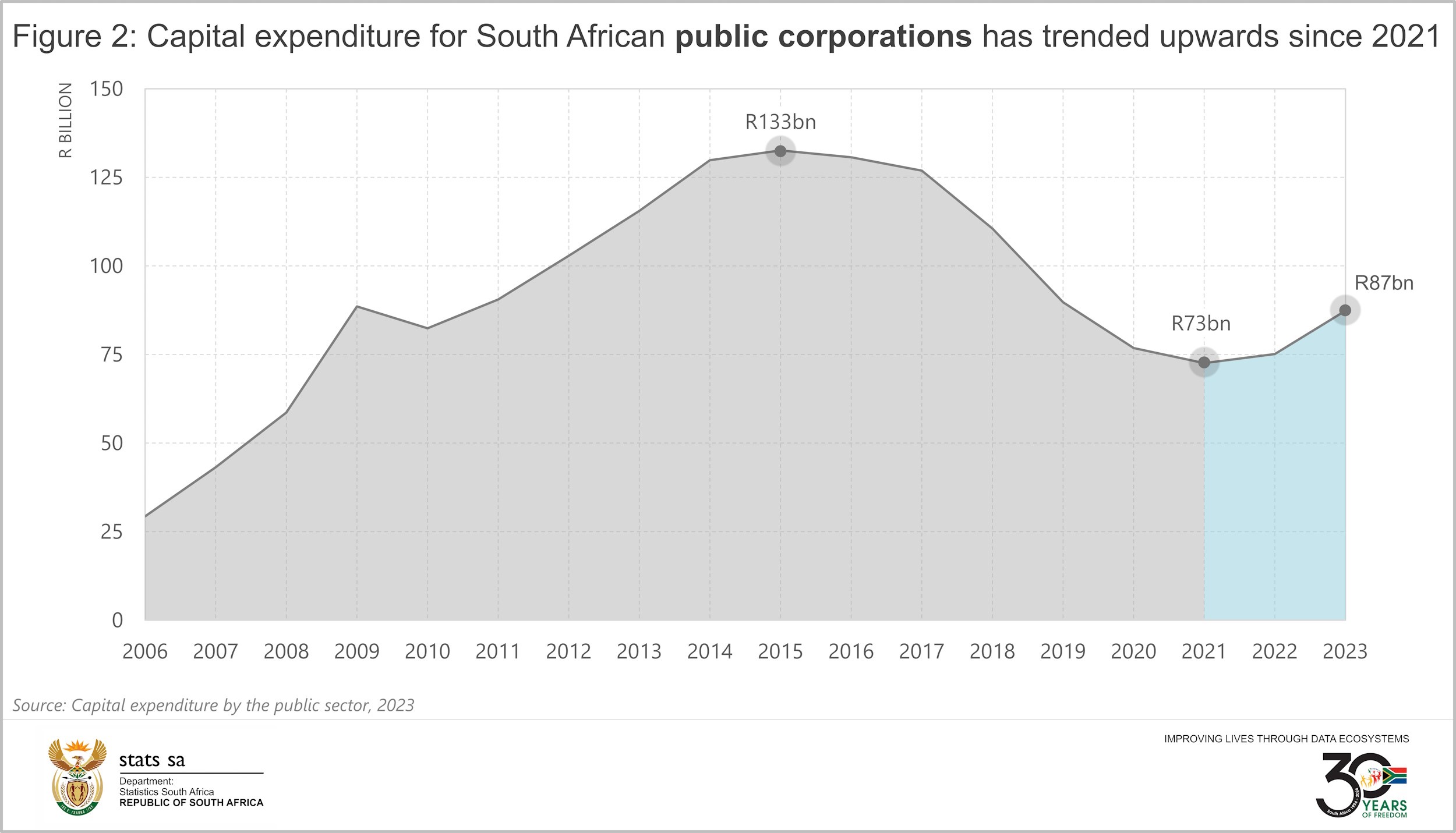 Public Corporations committed R87 billion to capital expenditure in 2023 (Figure 2). This accounted for 38% of total public-sector expenditure that year.