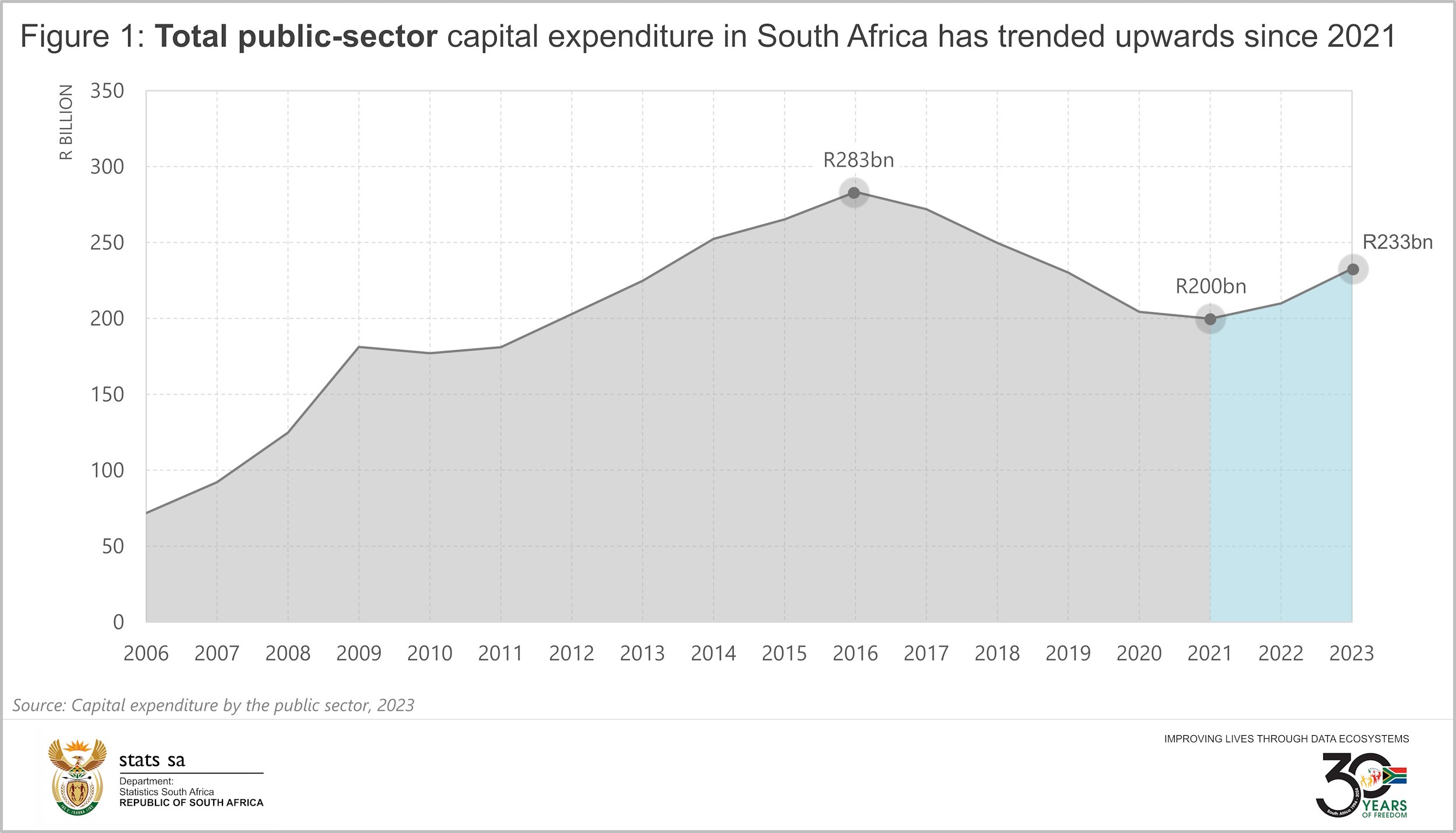 Capital expenditure includes money that is spent on machinery, construction, equipment, buildings, land and other fixed assets. In 2023, South Africa’s 749 public-sector institutions injected R233 billion of capital spending into the economy. This is 10,9% more than the R210 billion recorded in 2022 and represents the second successive increase following a five-year slump (Figure 1).