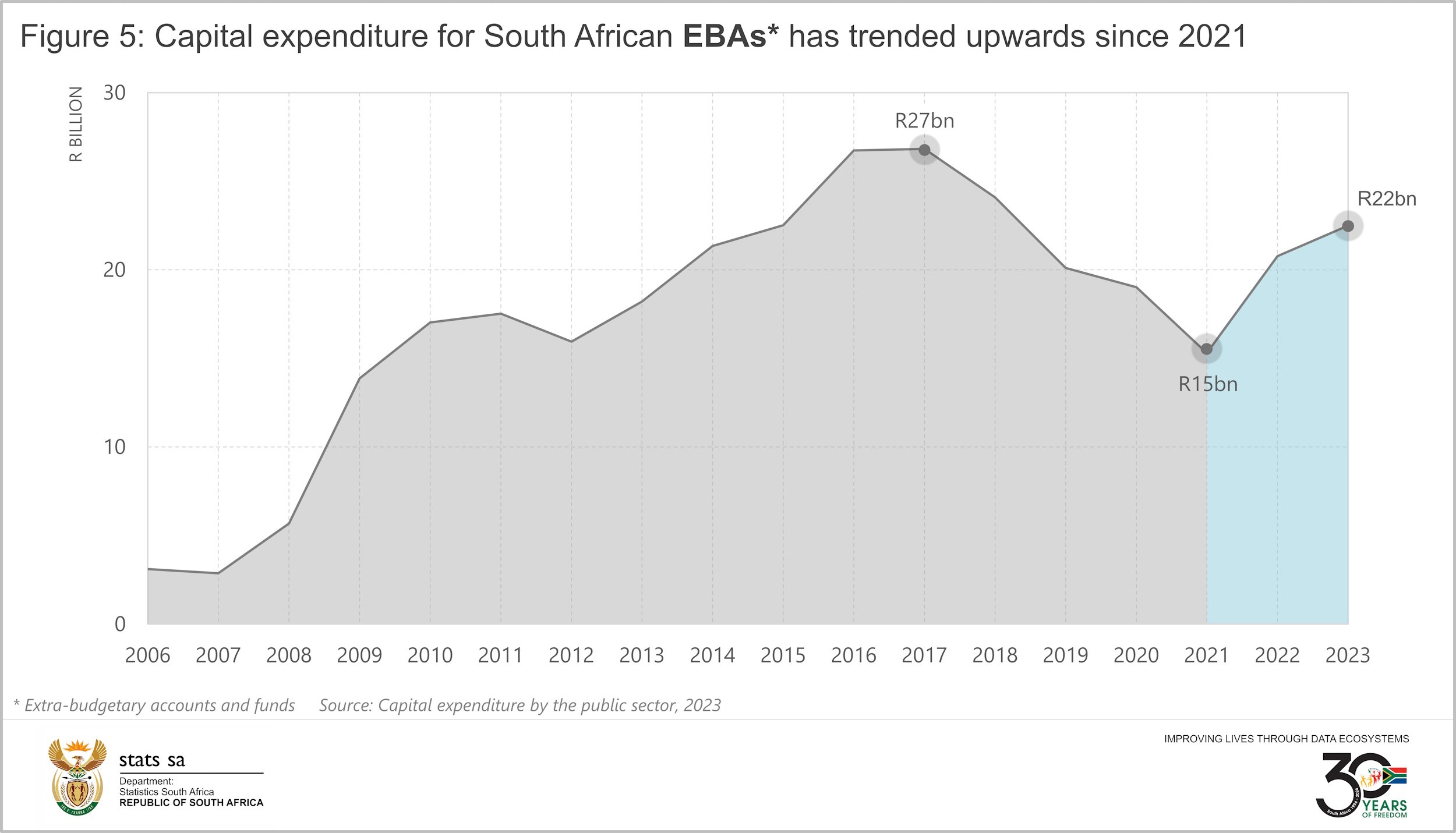 South Africa’s 258 EBAs are public institutions that provide services to the public on behalf of government. Examples include the National Research Foundation, the Unemployment Insurance Fund and the South African Social Security Agency. After declining to a low of R15 billion in 2021, EBA capital expenditure increased to R22 billion in 2023, accounting for 10% of overall public-sector capital expenditure (Figure 5).