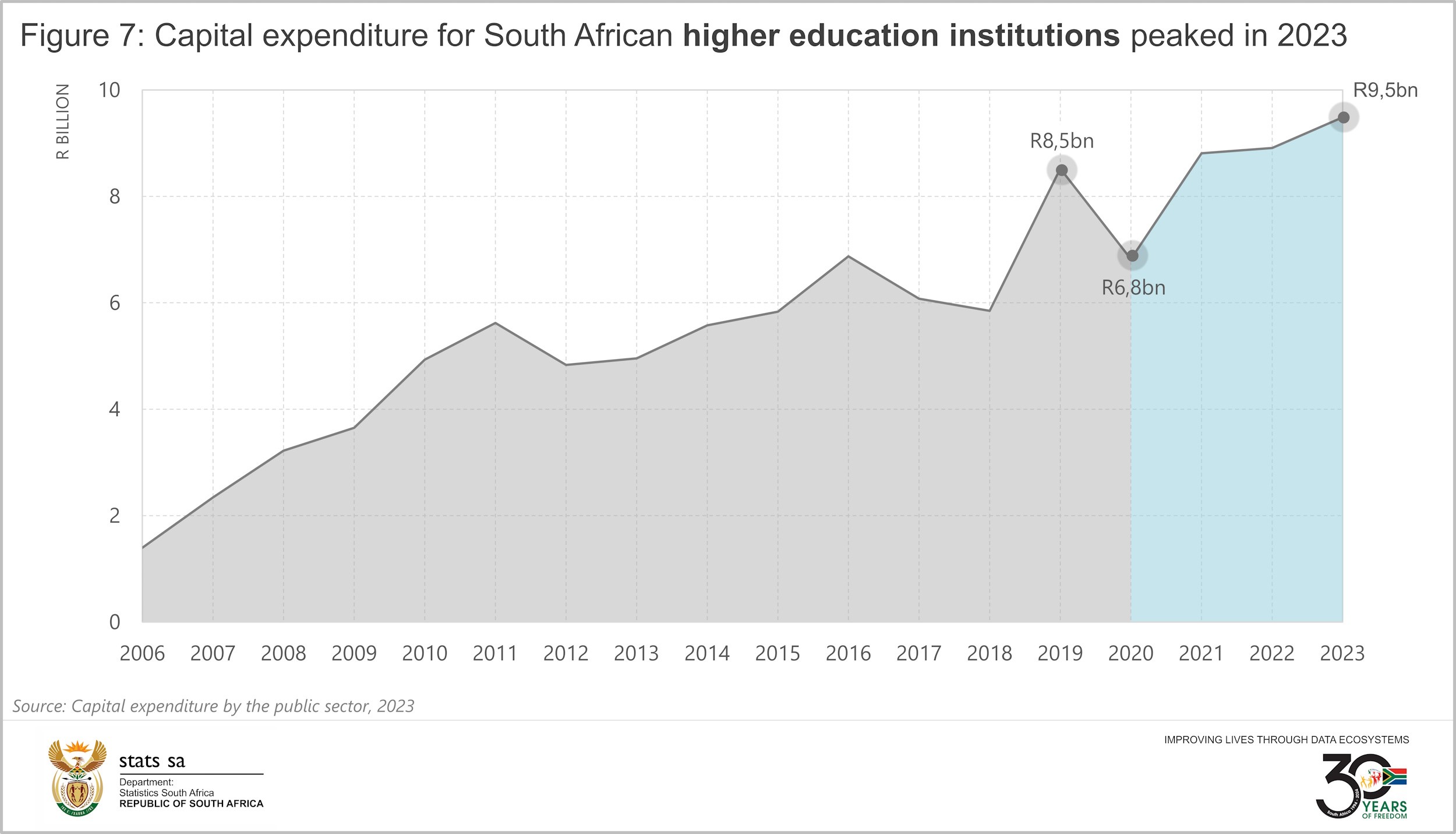 Capital expenditure for higher education institutions reached an all-time high of R9,5 billion in 2023 (Figure 7), representing 4% of total public-sector capital expenditure that year. Stellenbosch University accounted for R870 million, mainly on the construction of a 400-bed residence. The University of Mpumalanga incurred capital expenditure of R723 million, focussing on developing the west and south campuses of the university.