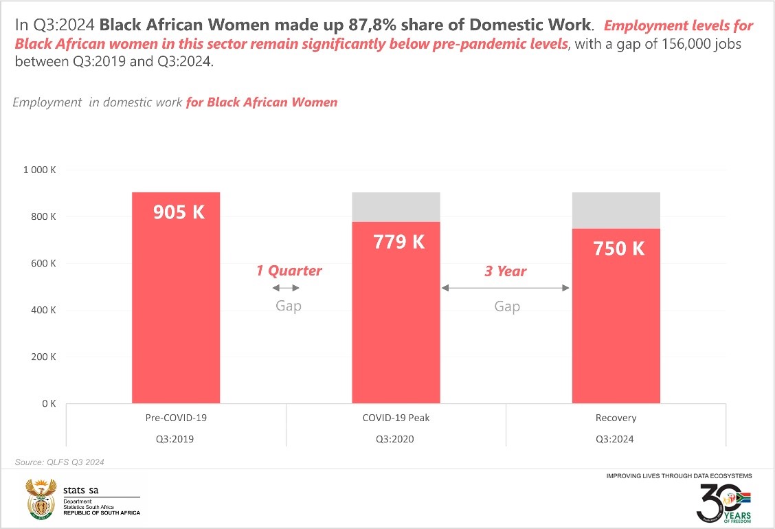 In South Africa, domestic work is a vital yet fragile part of the economy, primarily employing black African women, who experienced the steepest employment decline among population groups during the COVID-19 pandemic. Employment levels for black African women in this sector remain significantly below pre-pandemic levels, with a persistent gap of 156 000 jobs between Q3: 2019 and Q3: 2024.