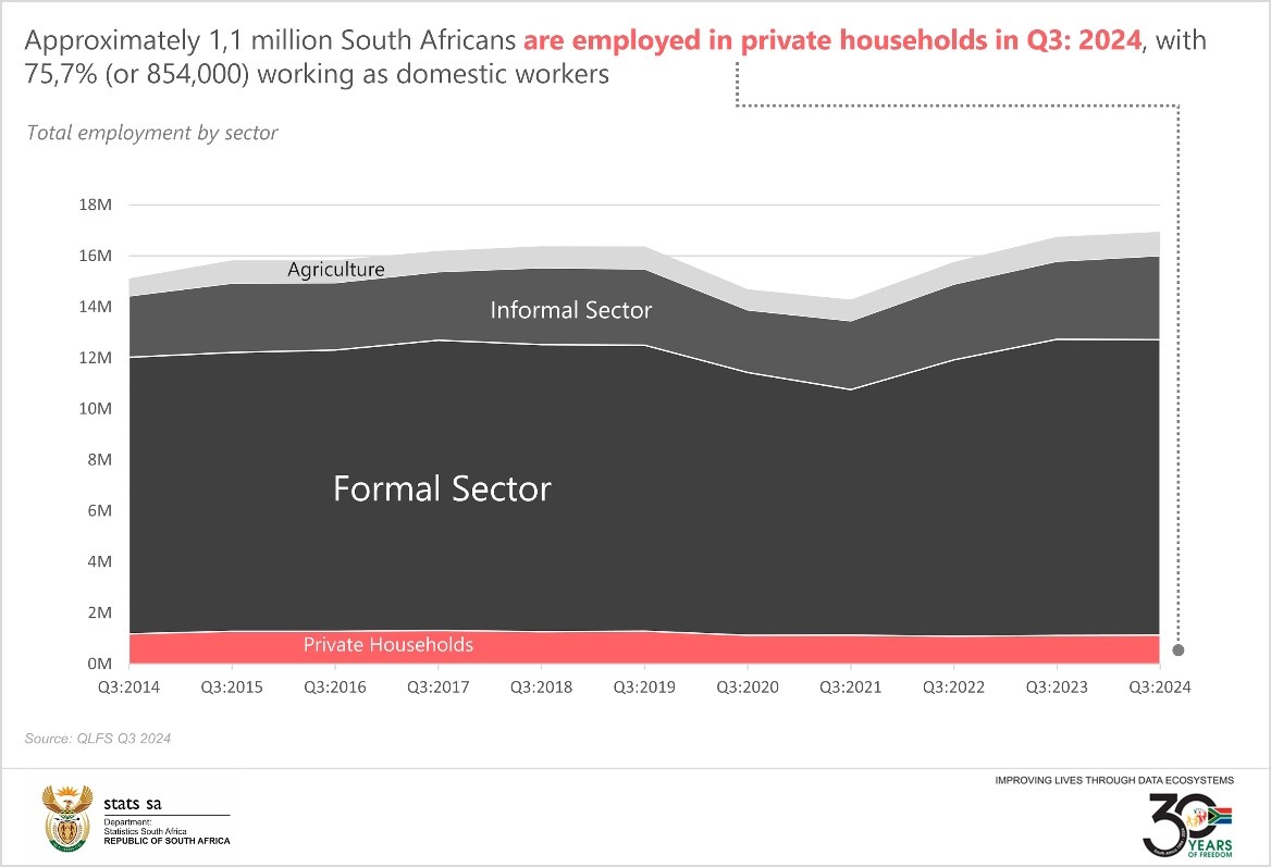 According to data from the Q3: 2024 Quarterly Labour Force Survey (QLFS), approximately 1,1 million South Africans are employed in private households, with 75,7% (or 854 000) working as domestic workers. These workers form an essential support system for families across the country.