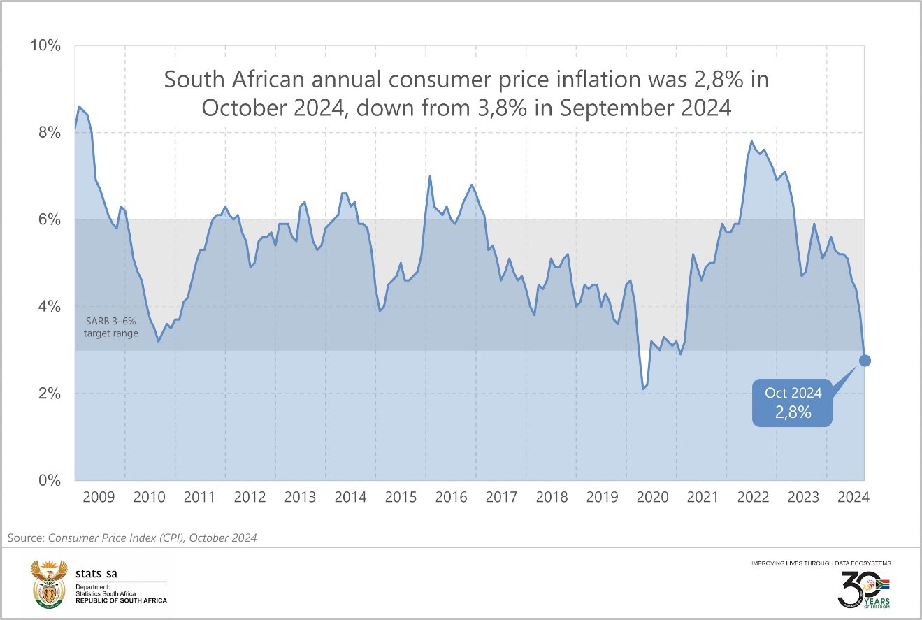 The consumer price index (CPI) increased by 2,8% in the 12 months to October 2024. This represents a sharp decline from 3,8% recorded in September. October’s print is the lowest since June 2020 (during the COVID-19 pandemic) when the rate was 2,2%.