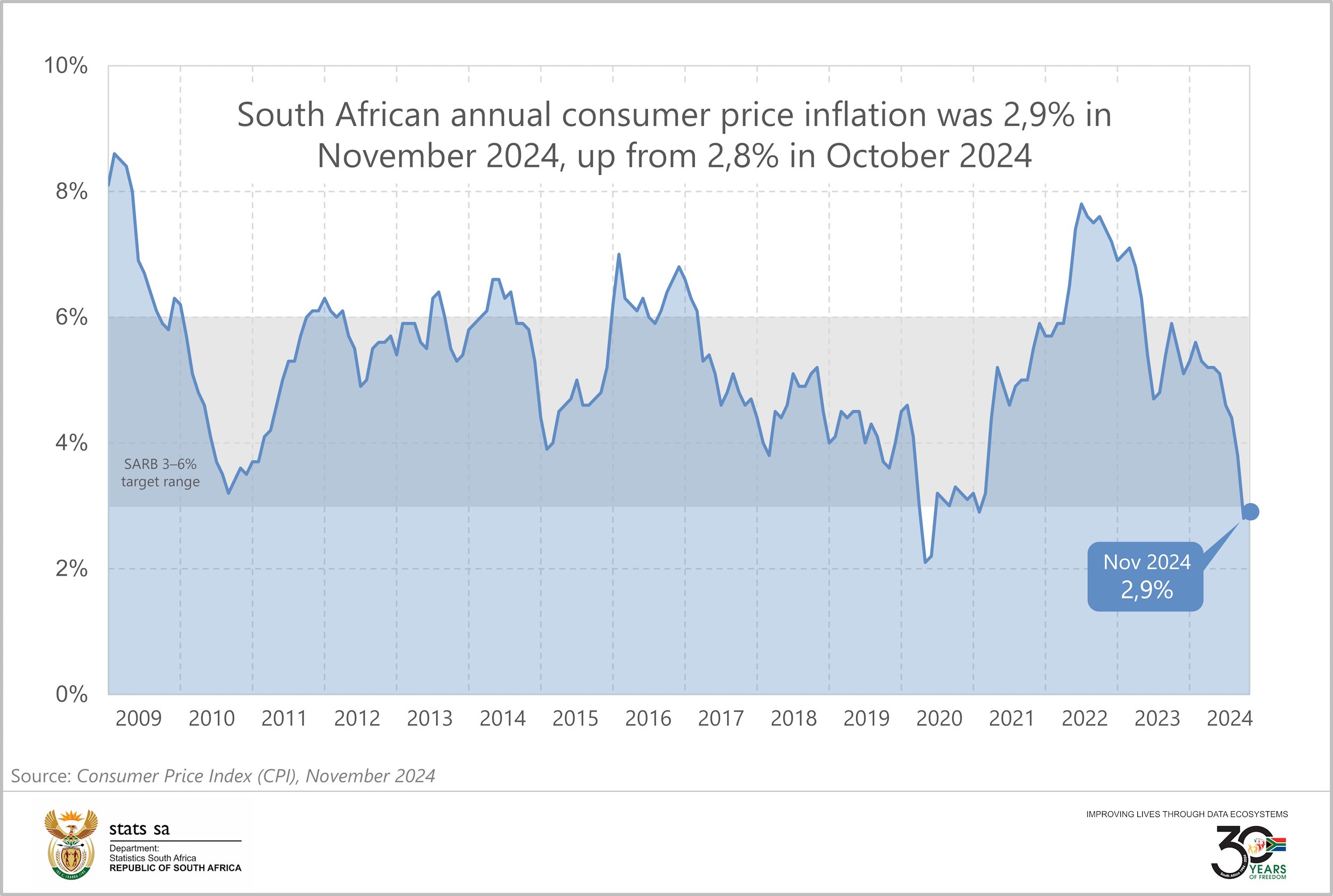 Annual consumer inflation was 2,9% in November, slightly up from 2,8% in October. There was no change in the consumer price index (CPI) between October and November.