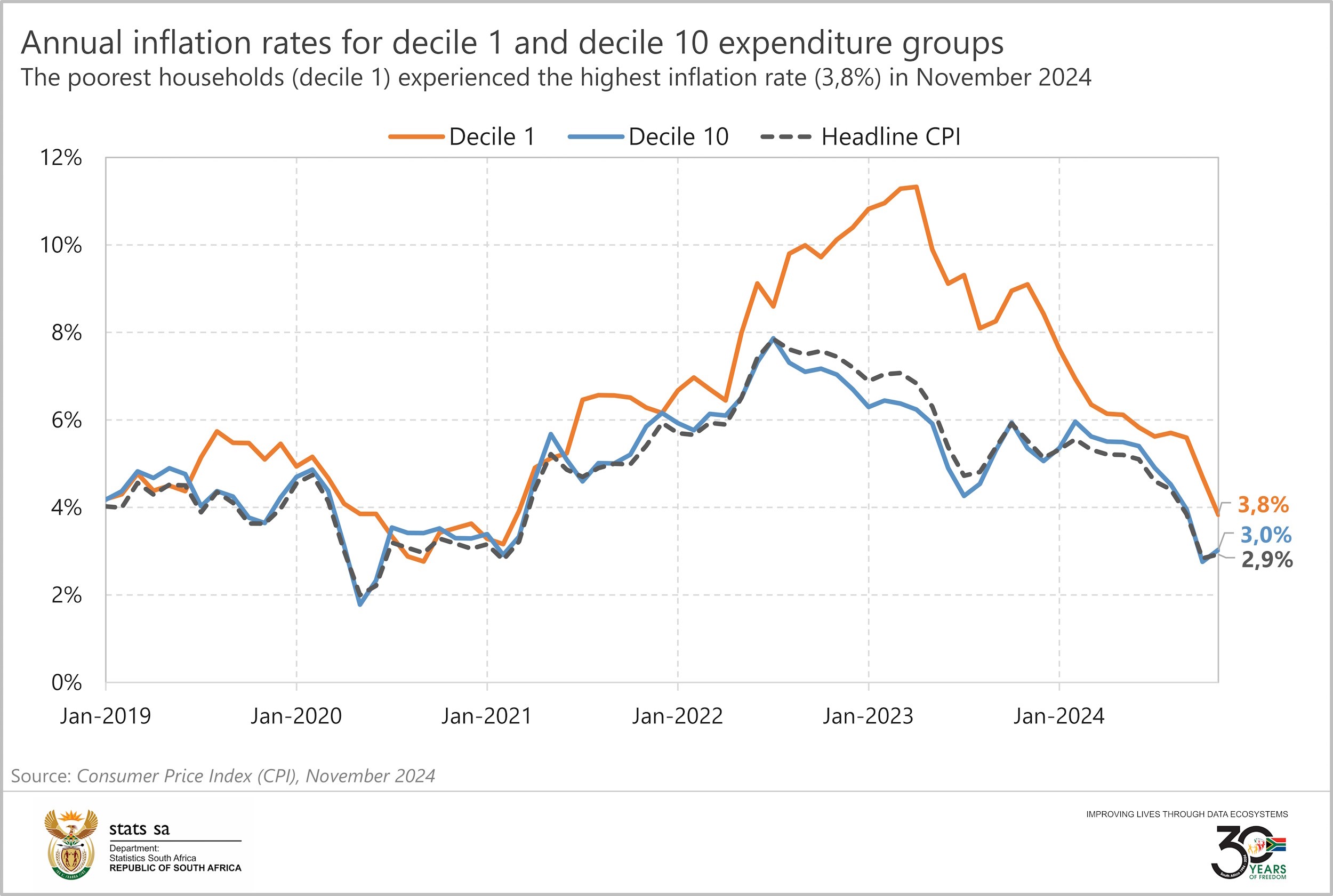 Stats SA calculates inflation rates for ten expenditure categories, providing insight into the impact of inflation on various socio-economic groups. The poorest households (decile 1) have shouldered the highest inflation rate since January 2022, peaking at 11,3% in April 2023. This declined to 3,8% in November 2024 but remains the highest across all expenditure categories. By contrast, the wealthiest households (decile 10) registered an annual increase of 3,0% in November, slightly above the headline rate.