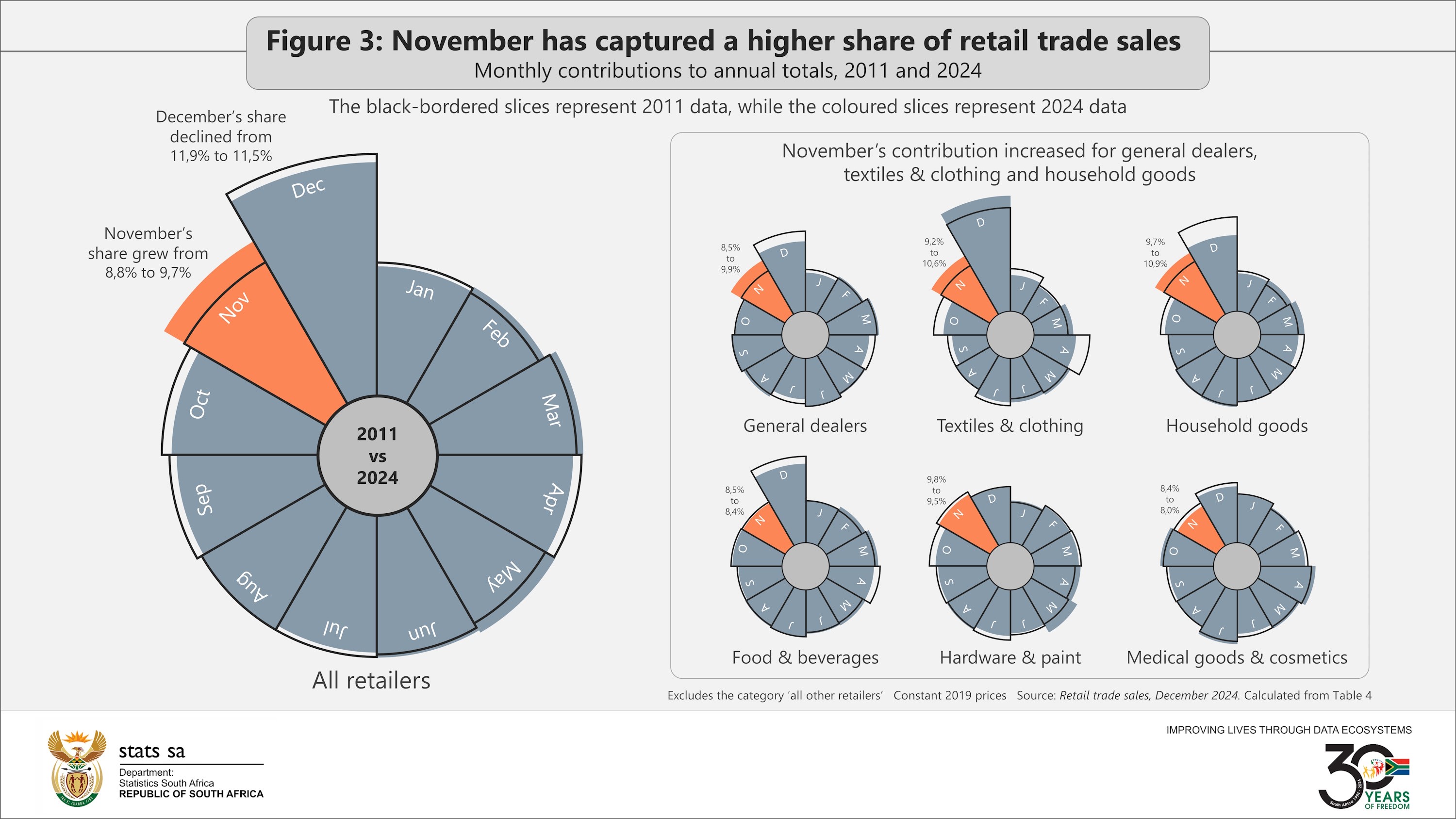 November sales accounted for 8,8% of the annual total in 2011 (Figure 2). After hovering in the 8,7%–9,0% range for a further five years, it edged higher in 2017, rising to a peak in 2020. After the height of the pandemic, November’s share waned for three years before rising again in 2024.
