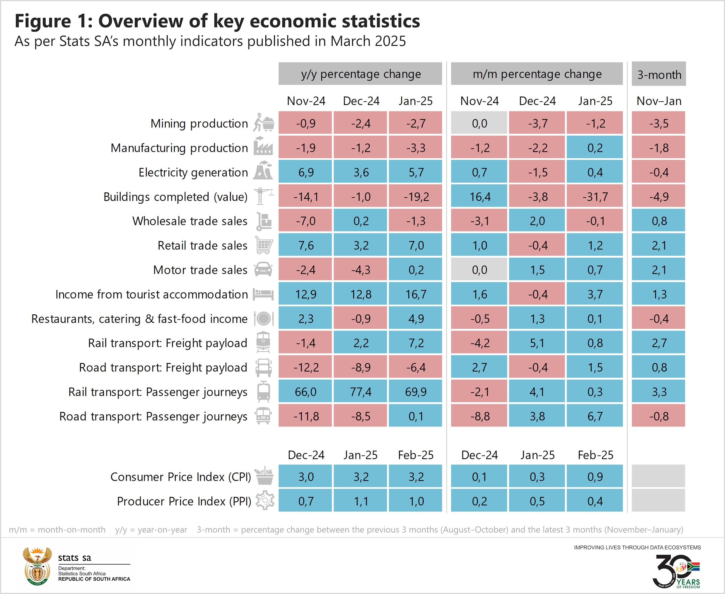 On the upside, passenger transport (both road and rail); rail freight transport; restaurants, catering & fast-food; tourist accommodation; motor trade; retail trade; and electricity generation registered positive year-on-year growth rates.