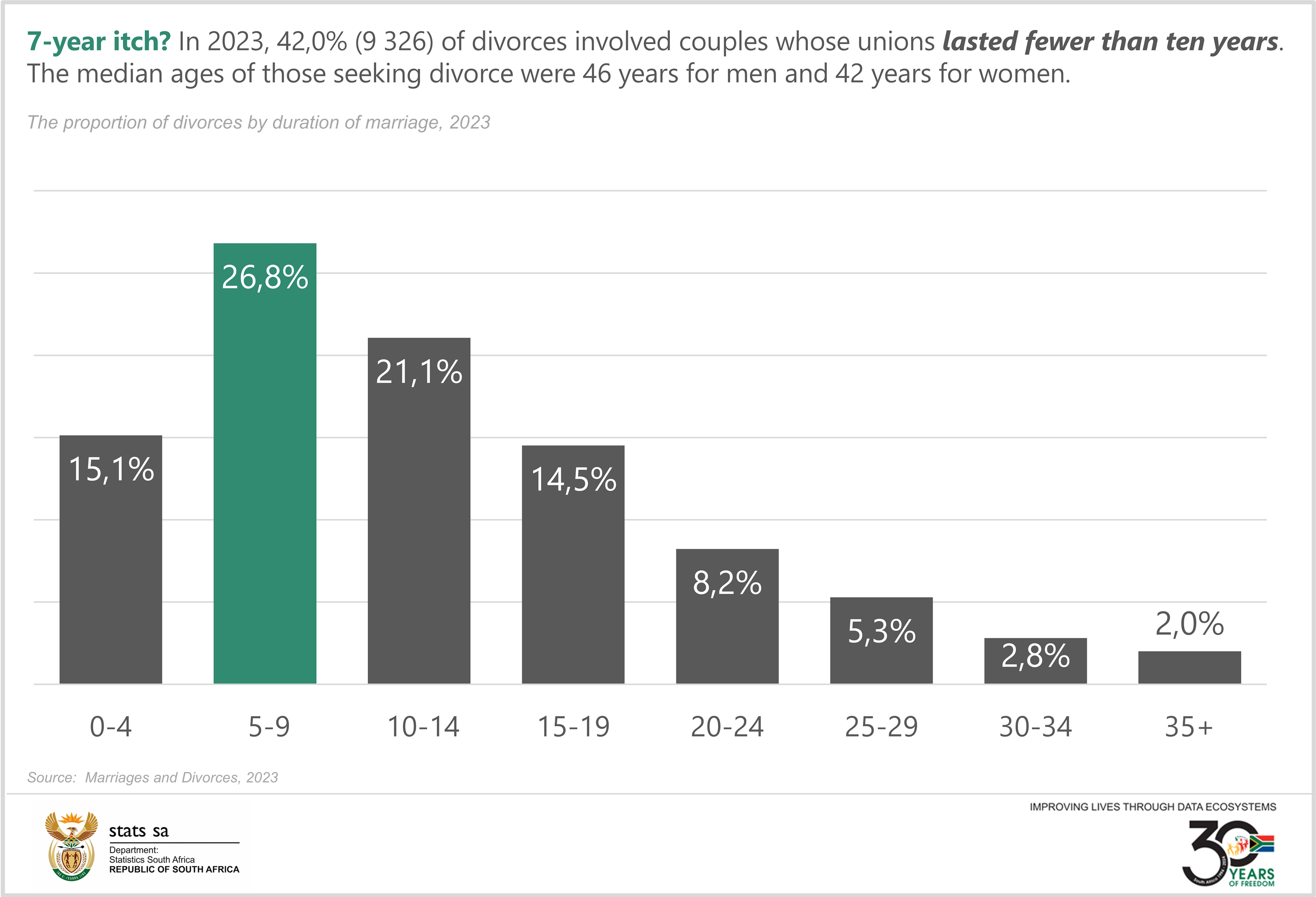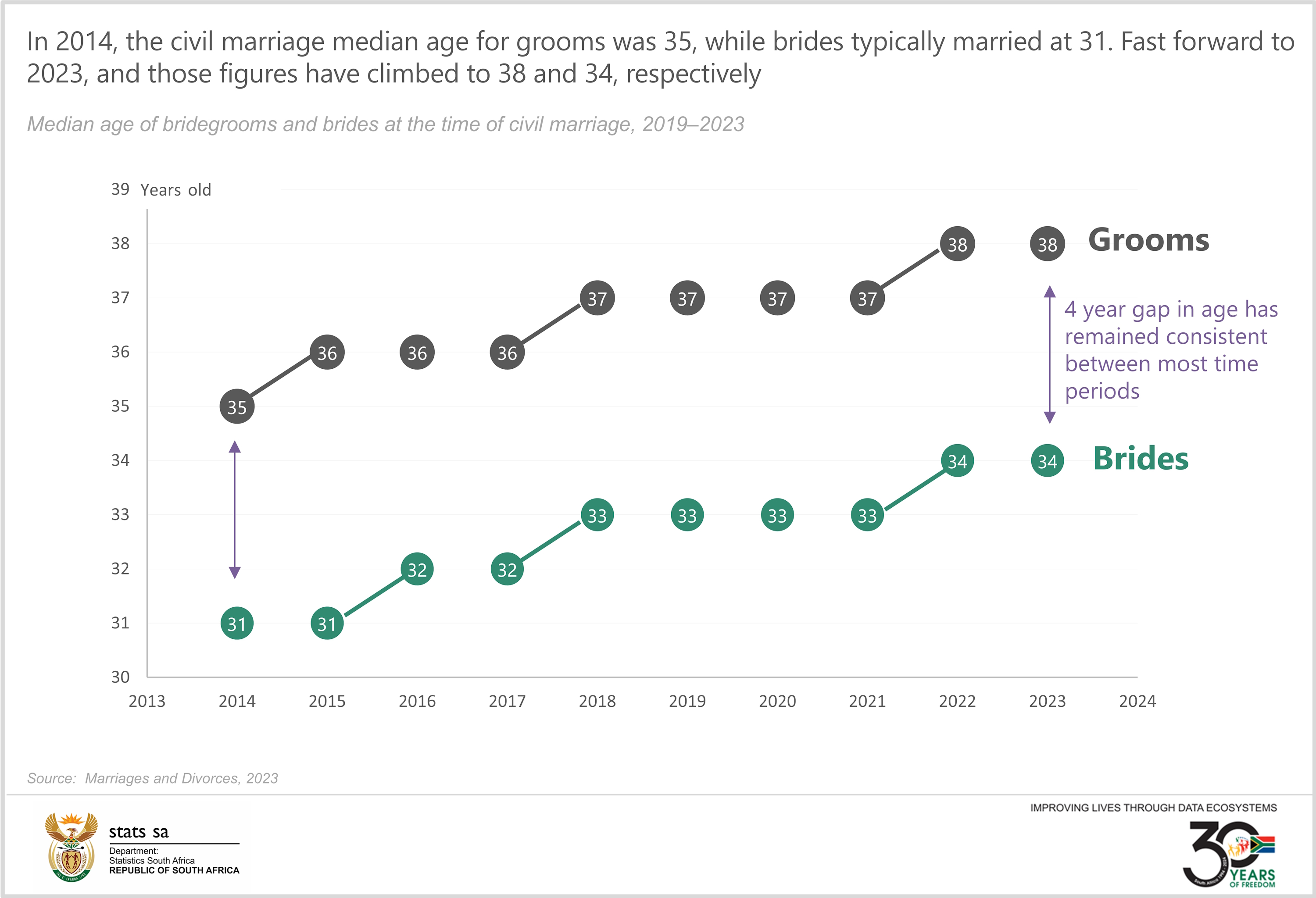 According to the latest Marriages and Divorces, 2023 report released by Statistics South Africa, in 2014 the median age for grooms engaging in civil marriages was 35, while brides typically married at 31. Fast forward to 2023, and those figures have climbed to 38 and 34, respectively.