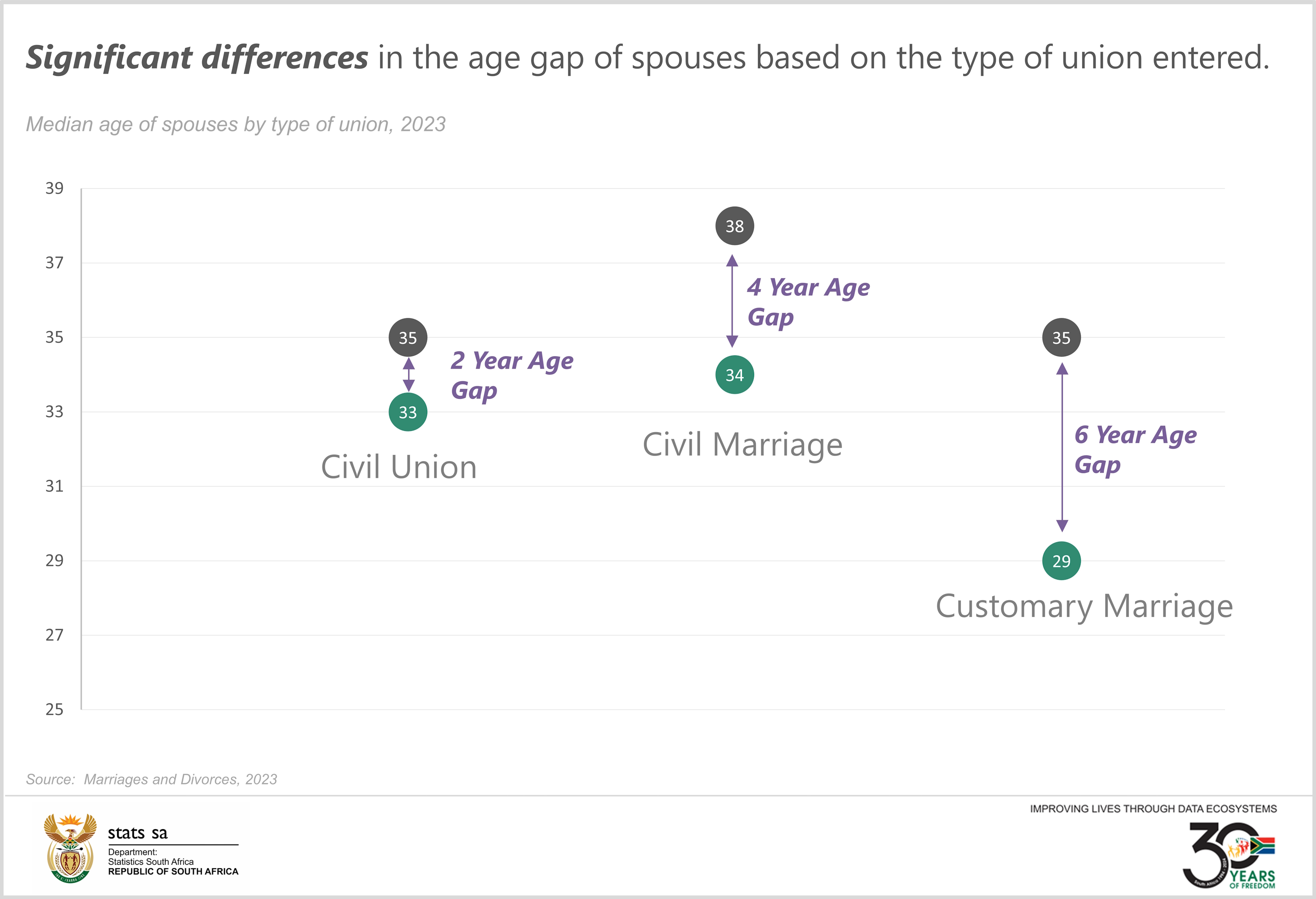 The age gap between spouses remains a defining feature of South African marriages. The number of registered customary marriages was 3 537 in 2023, which decreased by 19,2% from a total of 4 376 recorded in 2022. Most bridegrooms [3 079 (87,1%)] were older than their brides, with the gap in median ages at registration of customary marriage much wider than for other types of marriages. When looking at Civil Marriages, in 2023, most grooms—75,2% (74 703)—were older than their brides, while 16,1% (16 013) married older women, and only 8,6% (8 573) married someone the same age.