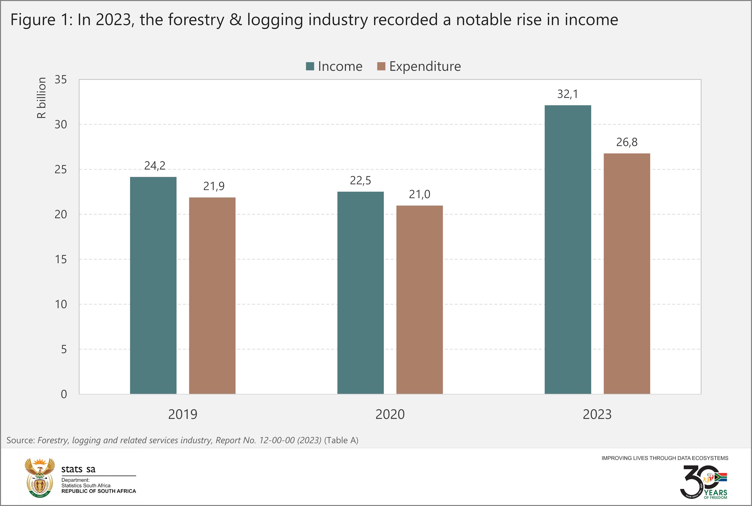 Forestry & logging generated income of R32,1 billion in 2023, up from R24,2 billion in 2019 (Figure 1). Although it is much smaller than manufacturing (R2,6 trillion)2, it is larger than the smallest of the 16 industries – ocean (marine) fisheries – which generated income to the value of R19,9 billion.3