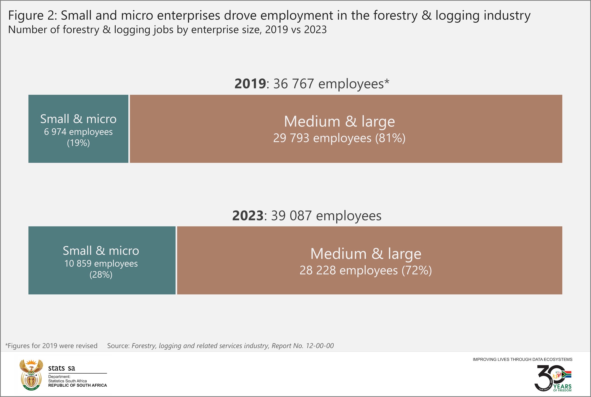 Small and micro enterprises drove this increase. If we compare with other industries, forestry & logging is dominated by large and medium enterprises.4 Despite this, small and micro enterprises created 3 885 jobs in the 2019–2023 period. Medium & large enterprises lost 1 565 employees (Figure 2). This pushed the employment contribution of small and micro enterprises up from 19% in 2019 to 28% in 2023.