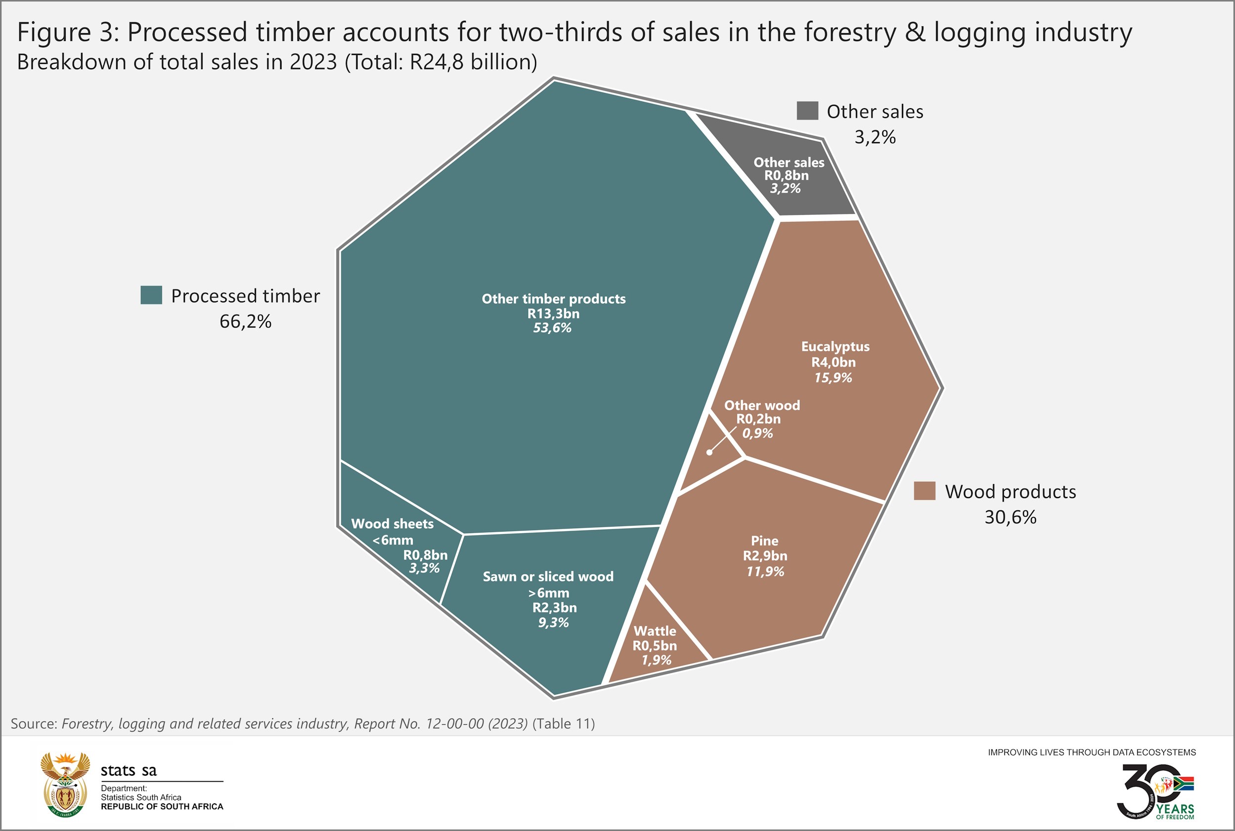 Forestry-related activities dominate the industry, generating R91 of every R100 of income in 2023. The remaining R9 was created by logging-related activities.