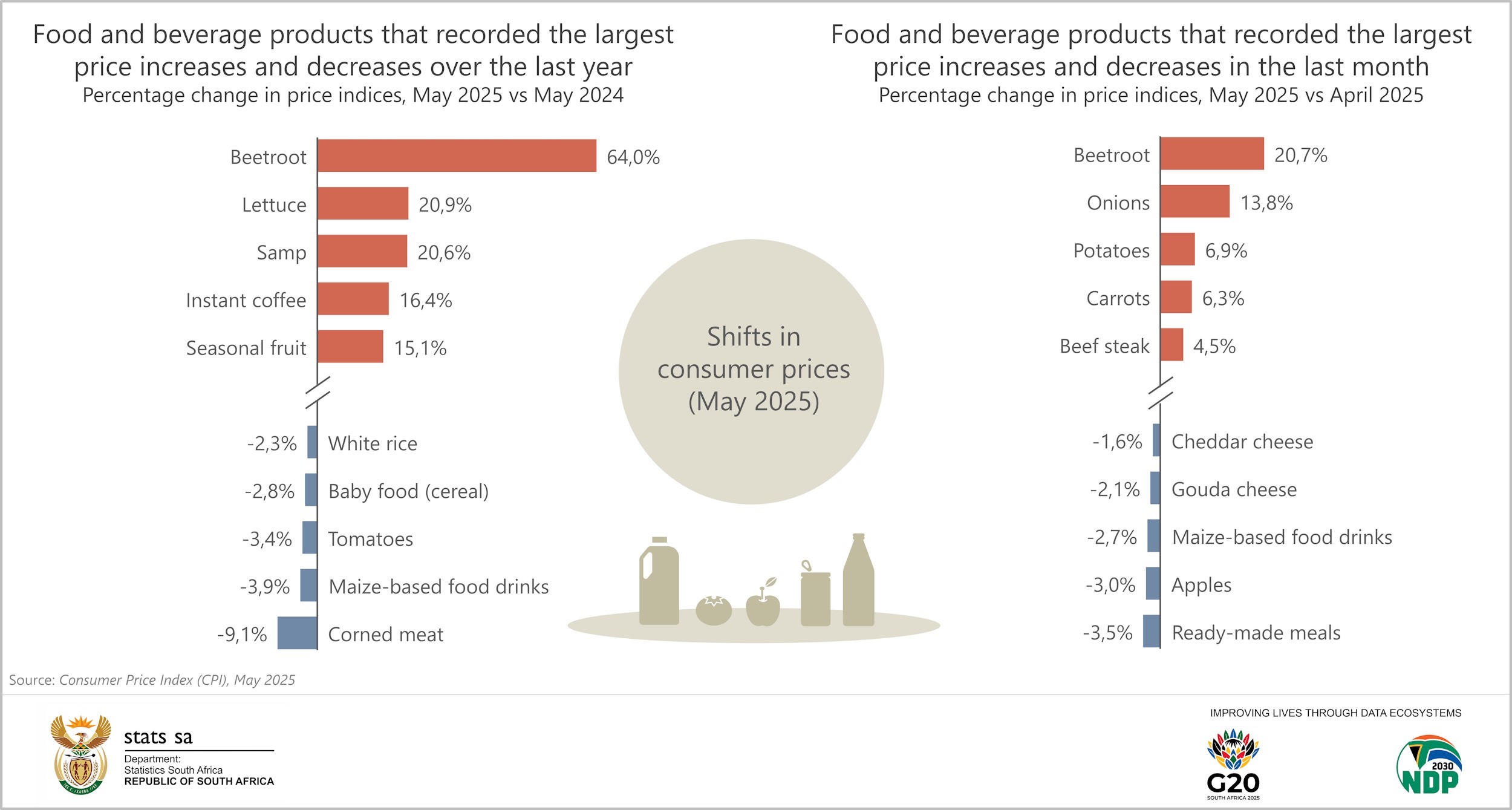 Vegetable prices tend to be highly volatile, depending on seasonal factors. The annual rate for the category was 10,3% in May, up from a recent low of -2,6% in November 2024. The rate in May is the highest since January 2024, when it was 12,6%. High annual increases were recorded for beetroot (64,0%), lettuce (20,9%) and carrots (13,4%).
