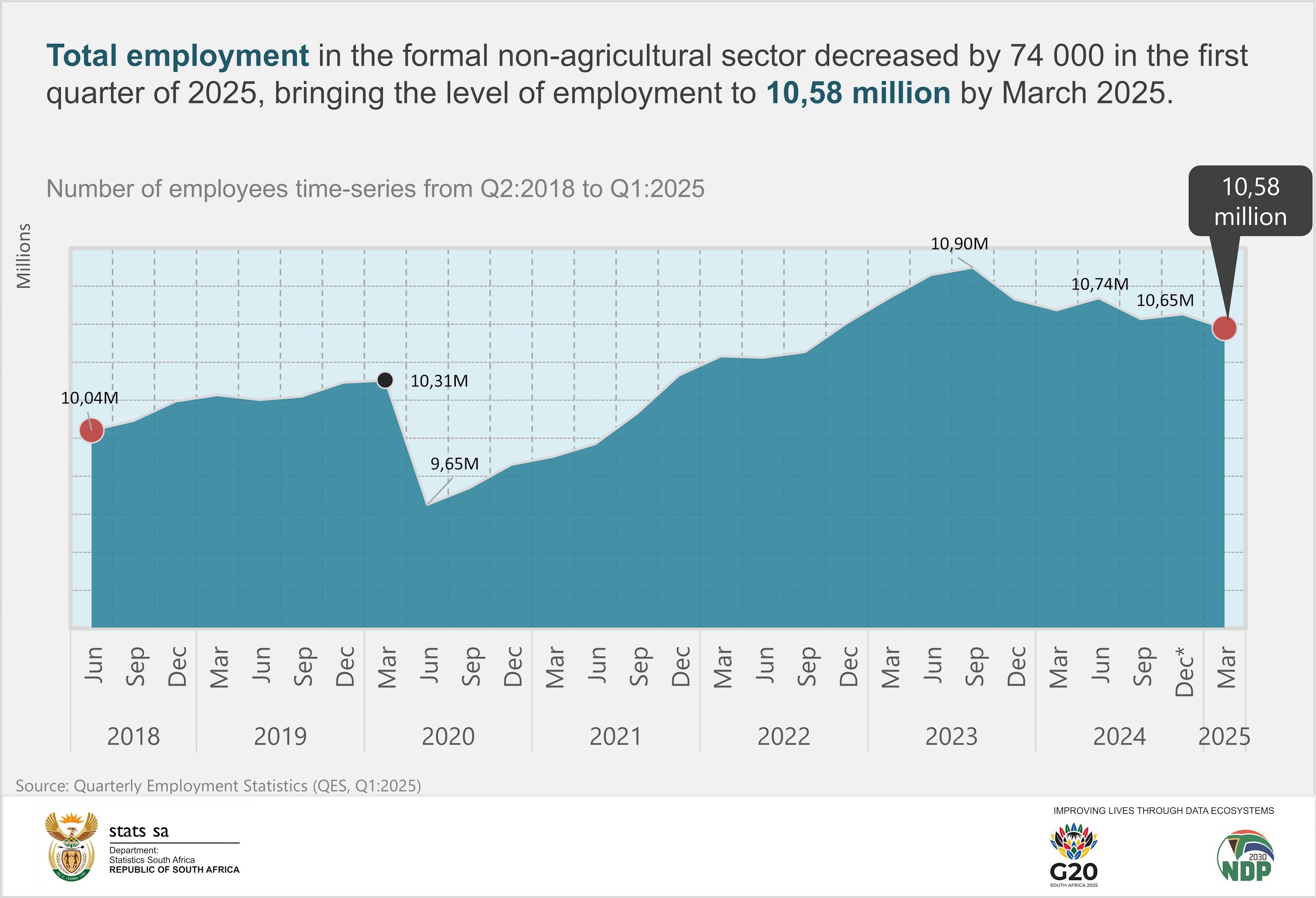 According to the Quarterly Employment Statistics (QES, Q1:2025) survey released by Statistics South Africa (Stats SA), total employment in the formal non-agricultural sector decreased by
