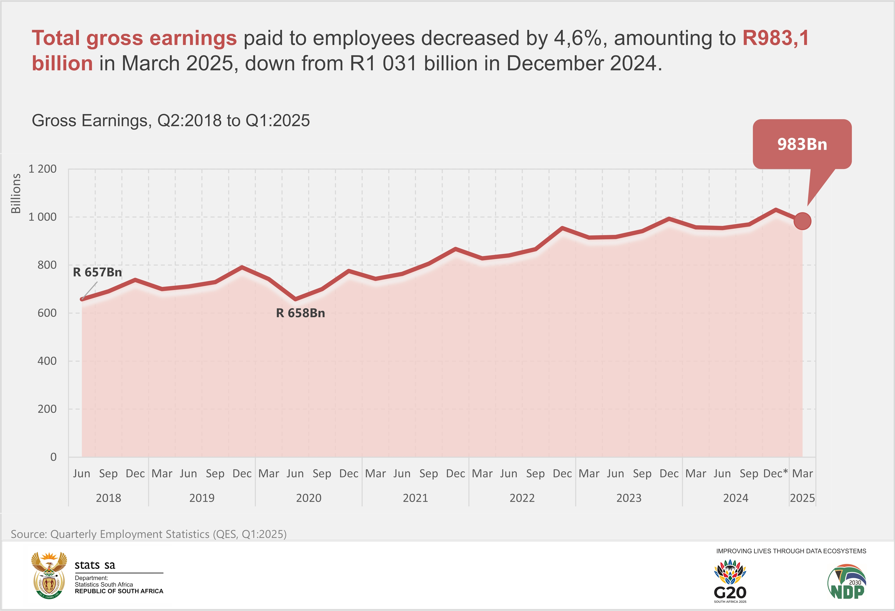 Total gross earnings paid to employees decreased by 4,6%, amounting to R983,1 billion in March 2025, down from R1 031 billion in December 2024. This decline was mainly driven by losses in earnings within the community services industry (-R12,8 billion), manufacturing industry (-R10,8 billion), trade industry (-R10,7 billion), construction industry (-R7,2 billion), transport industry (-R4,1 billion), electricity industry (-R2,1 billion), and mining industry (-R107 million). However, the business services industry reported an increase in gross earnings of R610 million.
