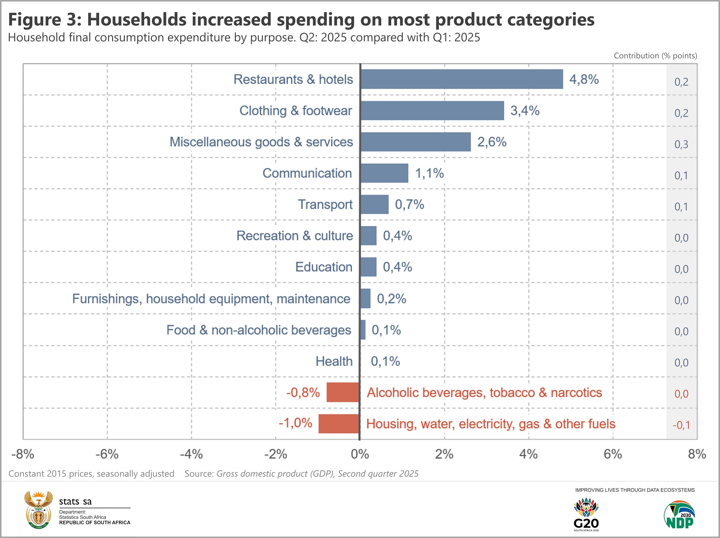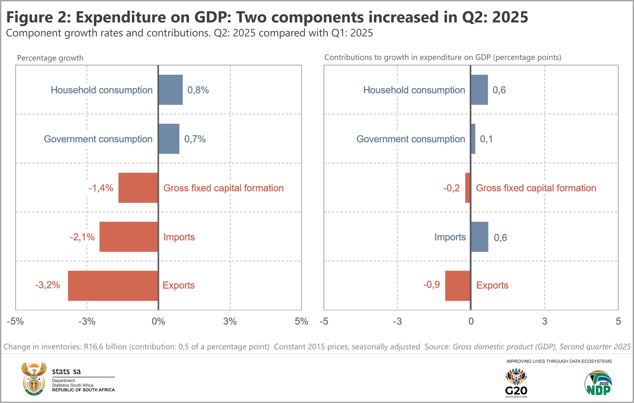 Following marginal growth of 0,1% in the first quarter of 2025, real gross domestic product (GDP) strengthened by 0,8%1 in the second quarter (April–June). Manufacturing, mining and trade led growth on the production (supply) side of the economy. The expenditure (demand) side was also positive, lifted mainly by stronger household consumption and softer imports.