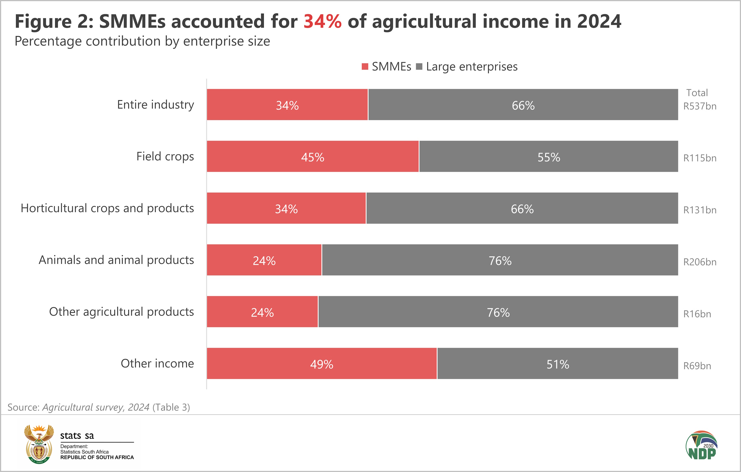 In terms of employment, SMMEs accounted for just over half of the agricultural workforce (i.e. 425 684 of 840 407 employees).