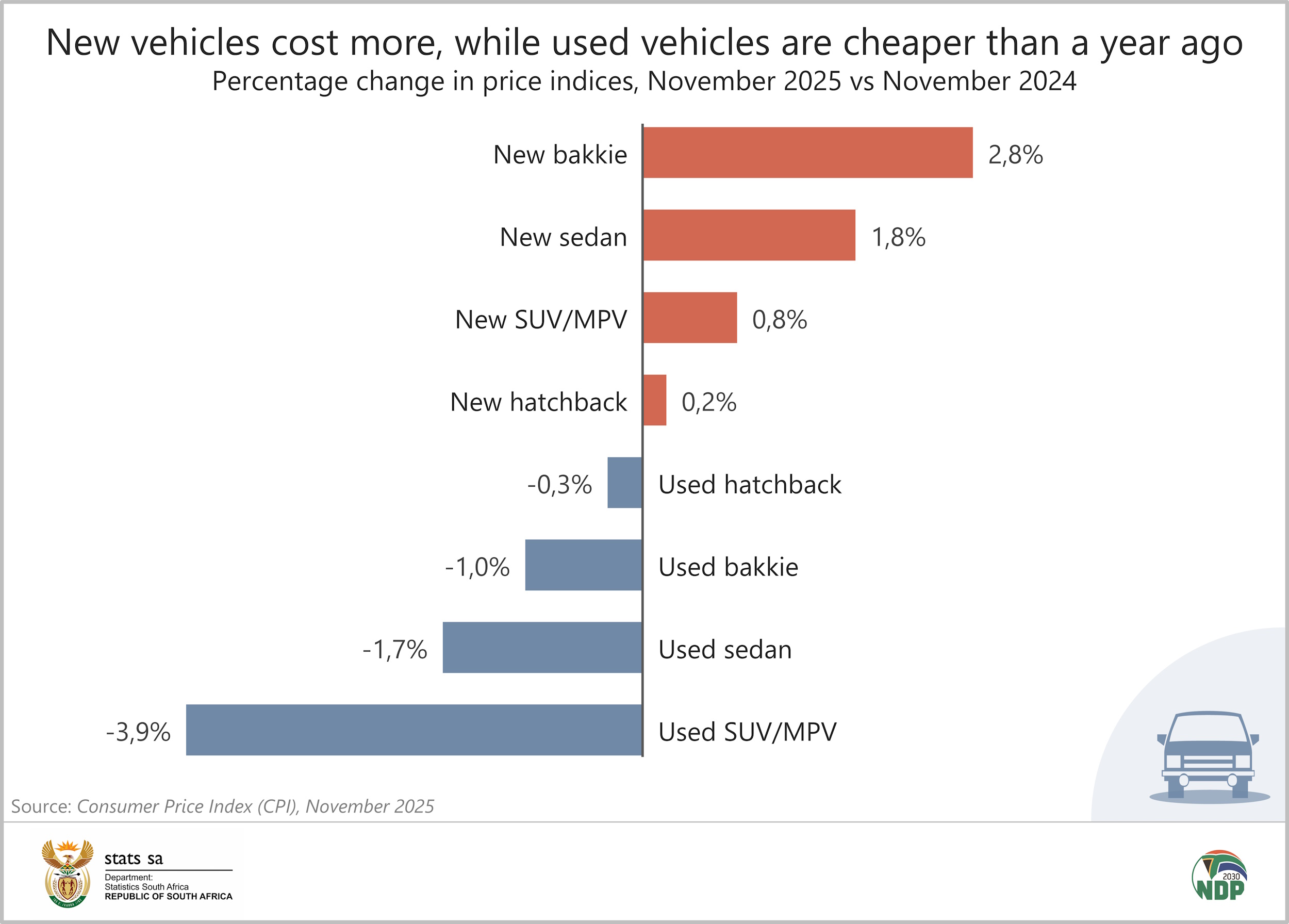 A closer look at the data reveals a consistent decline in used vehicle prices since August 2024. Used vehicles were on average 1,8% cheaper in November 2025 than in November 2024. New vehicles, on the other hand, were 1,2% more expensive.