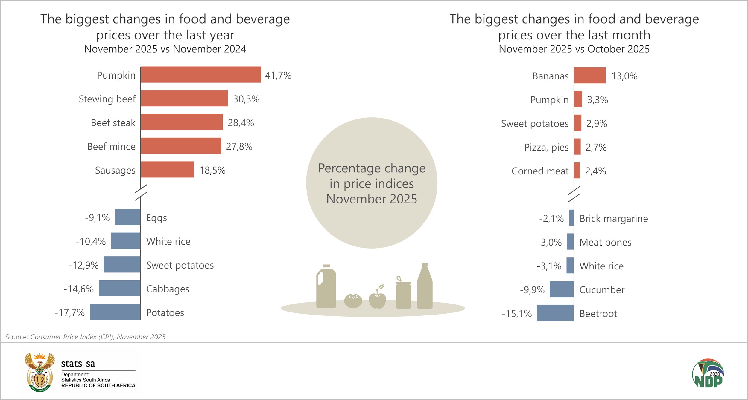 Inflation for cereal products moderated to an annual 1,7% from 2,0% in October. The monthly change was -0,6%. Prices for key staple cereals registered monthly declines, including white rice (-3,1%), maize meal (-0,8%) and white bread (-0,5%).