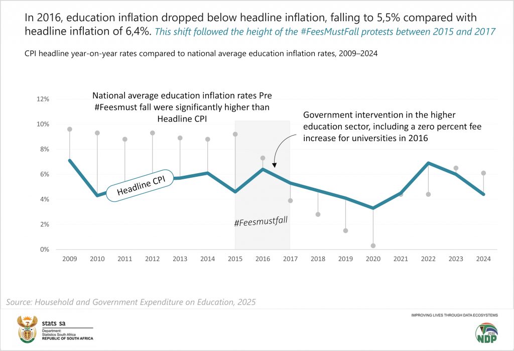 There are key exceptions. In 2016, education inflation dropped below headline inflation for the first time, falling to 5,5% compared with headline inflation of 6,4%. This shift followed the height of the #FeesMustFall protests between 2015 and 2017 and coincided with government intervention in the higher education sector, including a zero percent fee increase for universities in 2016. As a result, overall education inflation fell sharply from 9,2% in 2015 to 5,5% in 2016.