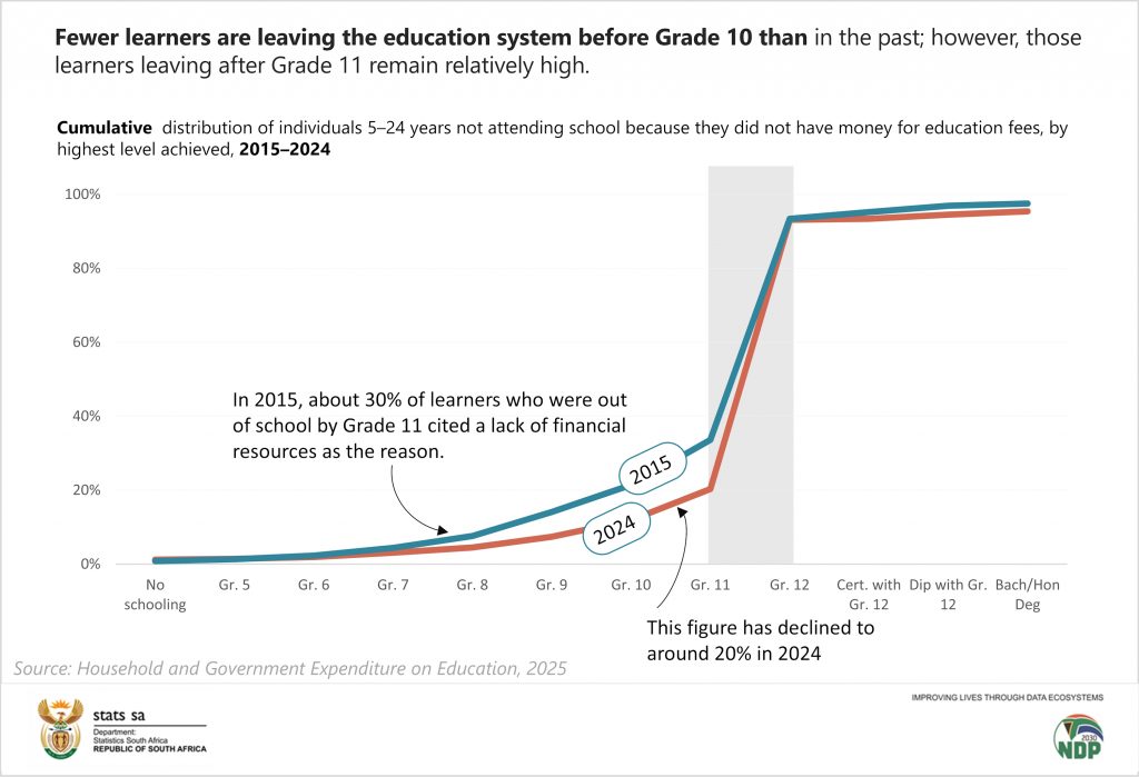 Fewer learners are leaving the education system before Grade 10 than in the past; however, those learners leaving after Grade 11 remain relatively high, suggesting that young people are staying in the system longer before financial pressures interrupt their progress — often at the point where further study becomes more costly.