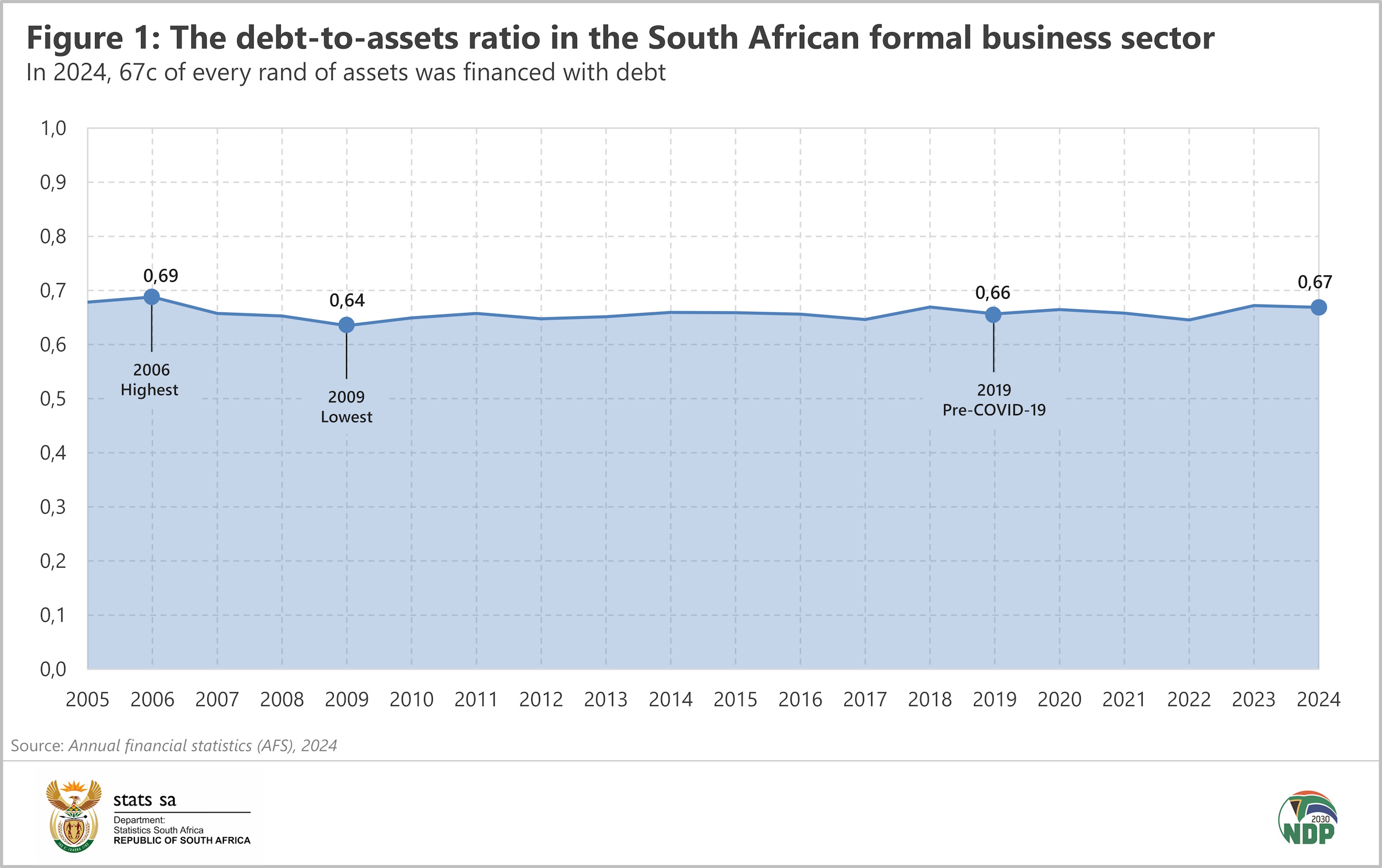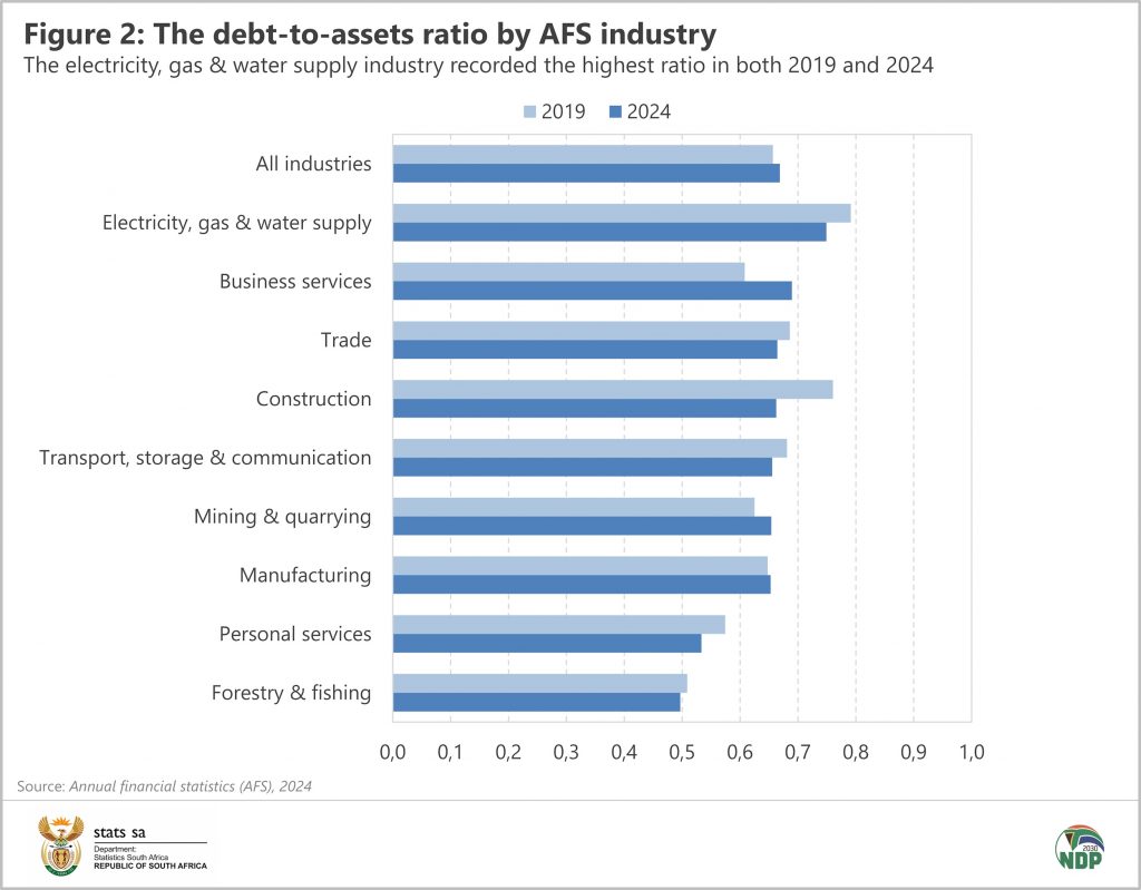 A rise in the debt-to-assets ratio may be a red flag, indicating increased vulnerability to debt. As shown by Figure 1 below, over the last two decades the debt-to-assets ratio for the formal business sector (as measured by the AFS) has remained relatively stable, fluctuating within a tight range of 0,6‒0,7. In 2024, the ratio was 0,67 (i.e. 67% of formal business assets were financed with debt that year).