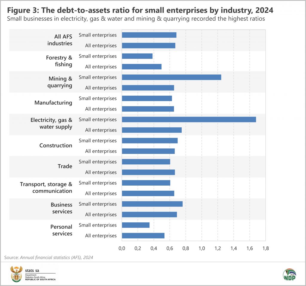 The AFS provides data for large, medium and small enterprises. In 2024, small enterprises posted a debt-to-assets ratio of 0,68, slightly higher than 0,67 recorded for the total formal business sector. Small enterprises in electricity, gas & water supply, and mining & quarrying recorded ratios greater than 1, as seen in Figure 3. Liabilities exceeded assets in these two cases.
