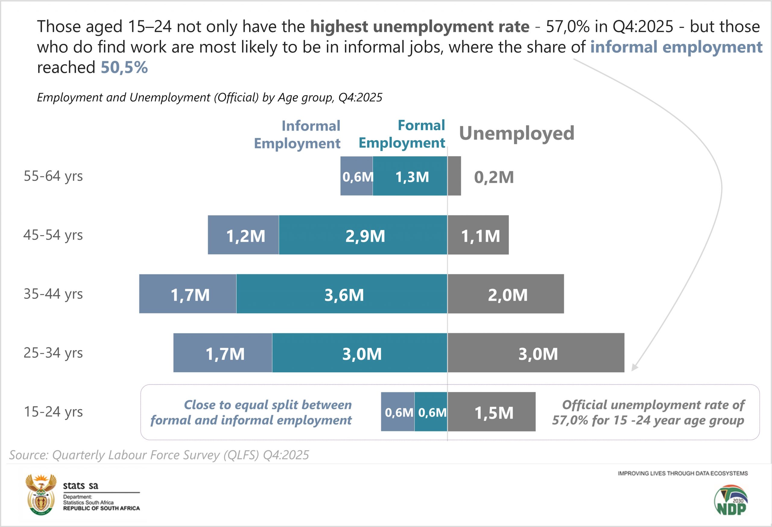 For young people, these challenges are even more pronounced. Those aged 15-24 not only have the highest unemployment rate – 57,0% in Q4:2025 – but those who do find work are most likely to be in informal employment. In this age group, the share of informal employment reached 50,5%, of total employment, the highest of any cohort.