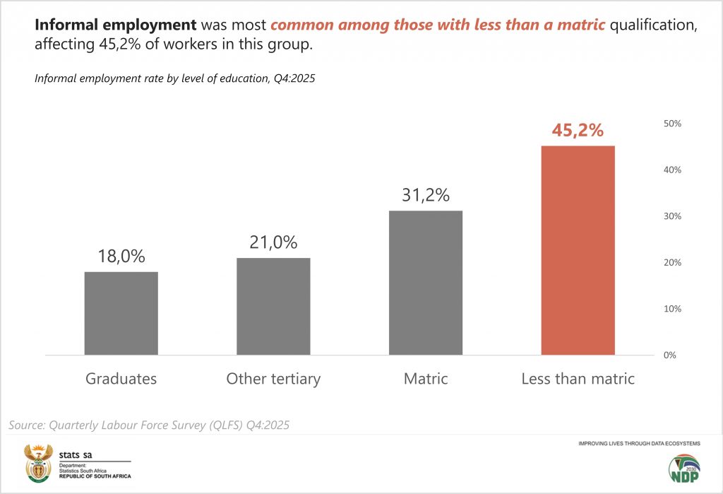In Q4:2025, informal employment was most observed among those with less than a matric qualification, affecting 45,2% of workers in this group. The likelihood of being in informal employment drops to 31,2% for people who have completed matric, declines further to 21,0% for those with other tertiary qualifications, and reaches its lowest level – 18,0% – among graduates.